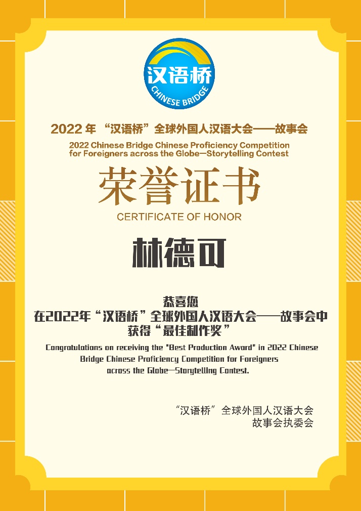 4月10日,由教育部中外语言交流合作中心主办,杭州文化广播电视集团承办的2022年“汉语桥”全球外国人汉语大会——故事会比赛结果公布,公司哥伦比亚籍2019级汉语国际教育专业硕士研究生林德可(FREDY ALBERTO TAMAYO OSSA)的参赛作品《突破》最终荣获“最佳制作奖”(10个“单项奖”作品之一)及“最佳指导教师奖”(8个“最佳指导奖”之一)。颁奖典礼在杭州通过线上、线下同步举办,公司参赛选手、指导老师及分管领导通过线上元宇宙颁奖典礼共同参加了颁奖活动。