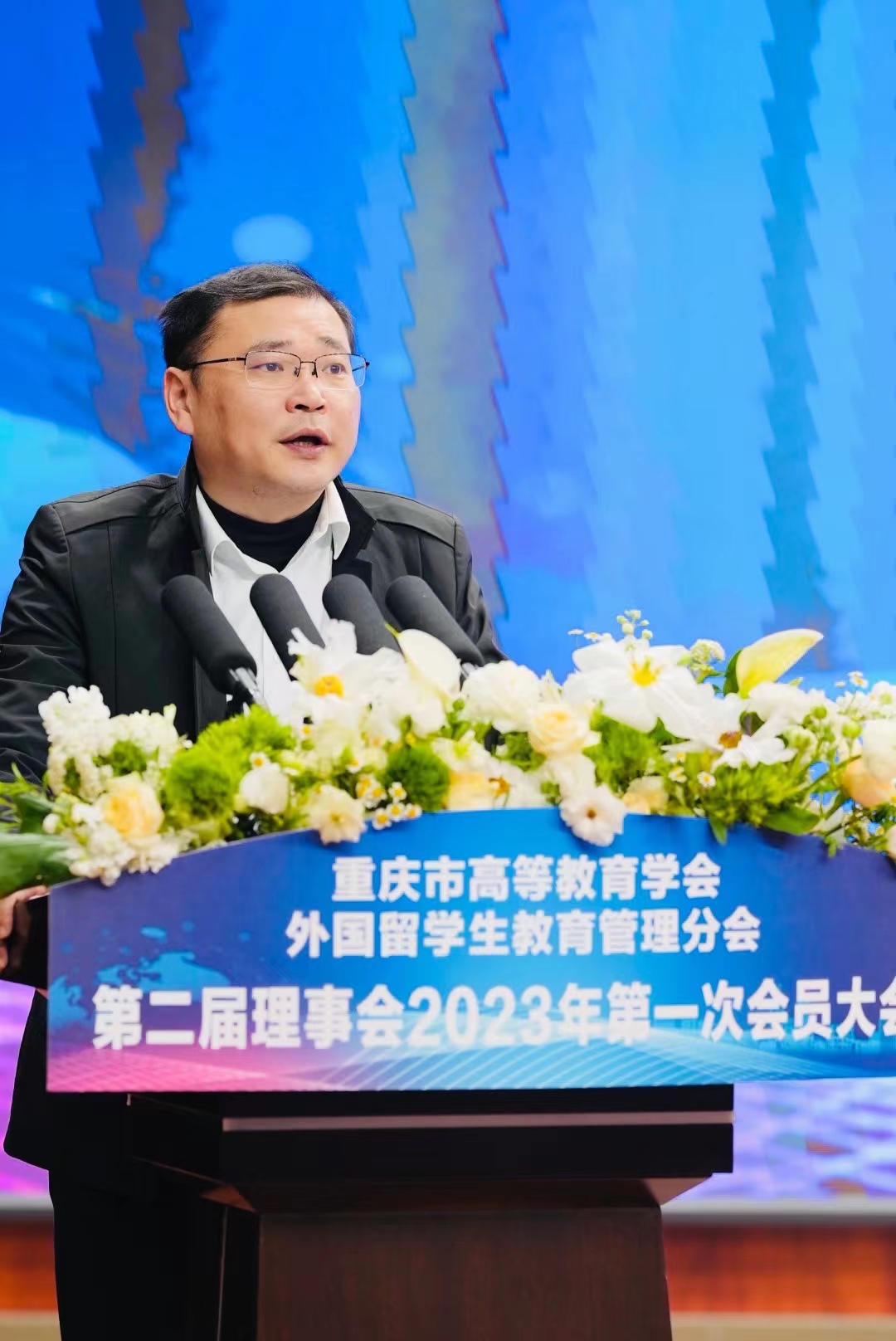 为学习贯彻党的二十大精神和习近平总书记关于教育的重要论述,推动全市来华留学事业高质量发展,3月22日,重庆市高等教育学会外国职工教育管理分会第二届理事会2023年第一次会员大会在重庆工商职业公司华岩校区举行。市外办涉外管理处处长杨瑜、市公安局出入境管理总队总队长张攀、市教委国际合作与交流处处长李斌、重庆工商职业公司董事长李国、市高教学会秘书长余志祥出席会议并讲话,全市37位会员单位理事及重庆市来华留学工作专家、来华留学先进个人代表100余人参加会议。