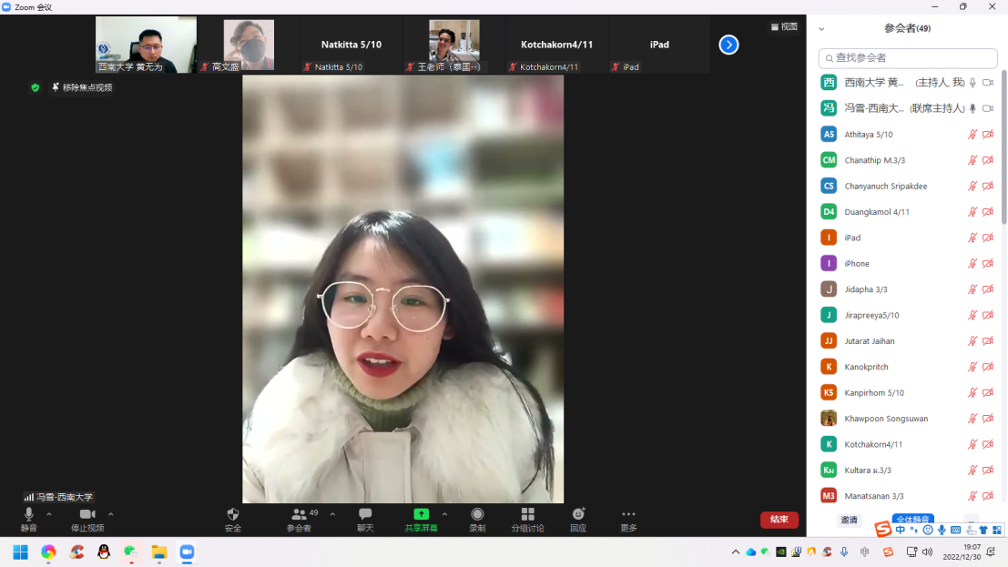 12月30日晚,2022年冬季汉语桥“玩转汉语,云游中国”中员工线上项目闭营仪式暨成果汇报展顺利举行,sunbet申搏汉教系本科教研室主任冯雪及授课老师、泰方负责老师王智、以及全体项目员工参加仪式。仪式由项目负责人黄无为主持。