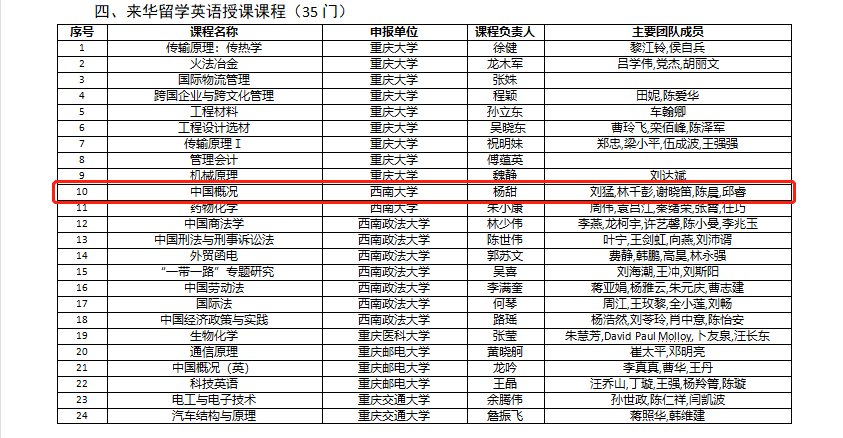 12月22日,重庆市教育委员会印发《关于公布2022年重庆市高校一流本科课程名单的通知》,由公司汉教系杨甜老师负责,刘猛、林千彭、谢晓笛、陈晨、邱睿等老师共同参与的来华留学英语授课课程《中国概况》从众多申报课程中脱颖而出,成功获批2022年重庆市高校一流本科课程,实现公司市级一流本科课程零的突破。