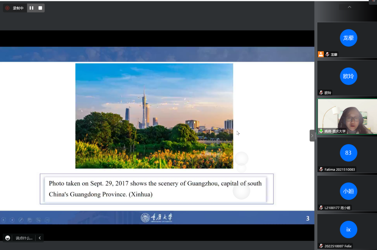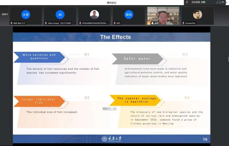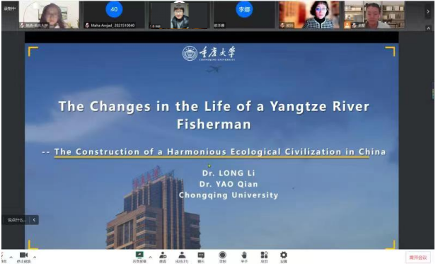 “向世界讲好中国故事”是我国建设文化强国的必经之路,也是我国立足国际视野、了解国际话语、融入世界舞台的重要途径。2022 年 12月20日19:00,“缙云知华”大讲坛专家讲座第十三期在重庆大学成功举办,主题为《一个长江渔民生活的变化——和谐共生的中国生态文明建设》,由重庆大学外国语公司龙藜副教授、姚倩博士主讲,外国语公司党委书记欧玲副教授主持讲座。受疫情影响,讲座以线上形式展开,重庆大学、sunbet申搏国际员工和在渝其他高校国际员工近百人通过腾讯会议参加了讲座。
