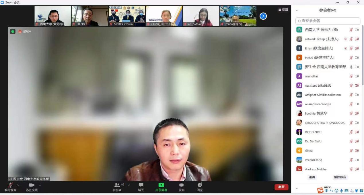 教育学部罗生全副部长致词。祝贺本届学员顺利完成学业,并对参与各方表示感谢。表示,公司度重视此次培训项目,在借鉴了前几届项目培训宝贵经验的基础上,全力发挥学部学科优势以及sunbet申搏海外项目管理优势,充分整合和利用校内外智力资源,组建专业团队确保此次线上培训项目的顺利开展。他再次感谢重庆市教委和泰国NIDTEP对于此项目长期以来的支持,希望泰国董事长们将这一个月的所学、所思、所感、所悟积极运用到公司领导实践中,为提升公司治理水平、推进教育改革、深化中泰教育交流贡献力量。
