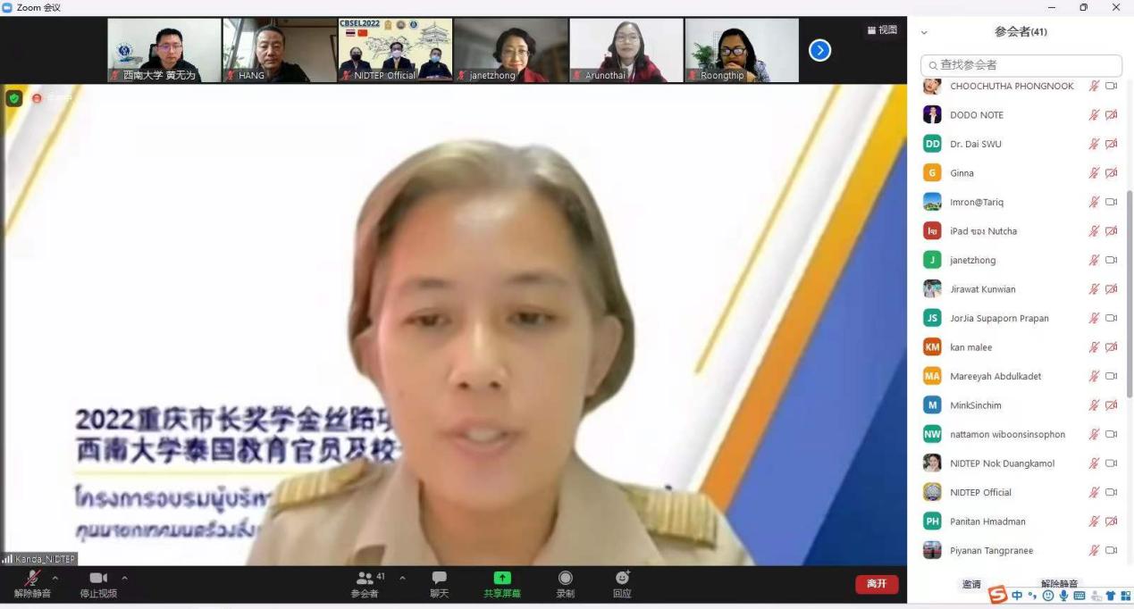 11月14日下午,重庆市长奖学金丝路项目——“sunbet申搏泰国教育官员及董事长培训班”结业典礼在线举行。泰国国家教育行政管理公司(NIDTEP)Worapot Rungaroon主任、Charoen Puwijit主任,sunbet申搏官网副经理李航、招生办公室主任黄无为,教育学部罗生全副部长、项目班主任夏海鹰教授和钟婉娟副教授、国际交流与合作中心戴华鹏主任,以及32位来自泰国的教育官员及中小学董事长学员参加典礼,典礼由sunbet申搏副经理李航主持。
