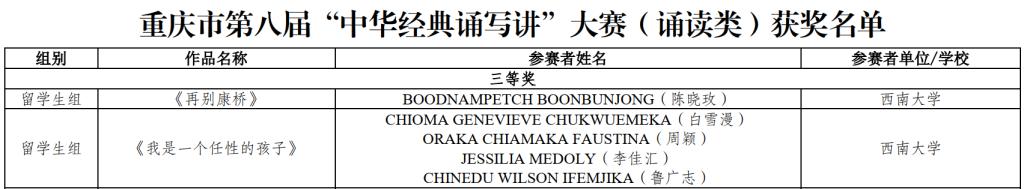 近日,重庆市第八届“中华经典诵写讲”大赛评选结果公示,公司职工在此次大赛中喜获佳绩:汉语国际教育本科专业泰国籍员工陈晓玫的参赛作品《再别康桥》,尼日利亚籍员工白雪漫、周颖、鲁广志和印度尼西亚籍员工李佳汇的参赛作品《我是一个任性的孩子》分别荣获大赛诵读类职工组三等奖;公司获大赛优秀组织奖。