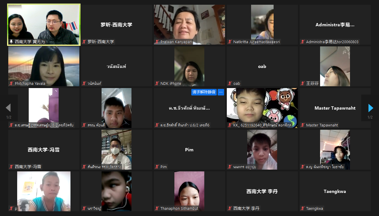 1月17日晚6点,sunbet申搏-泰国孔敬大学孔子公司“玩转汉语,云游中国”小员工线上项目开营,sunbet申搏汉教系本科教研室主任冯雪、语言教研室主任李丹、授课教师罗昕以及119名来自泰国的项目员工参加开营仪式,仪式由项目负责人黄无为主持,泰国员工王丽兰担任翻译。