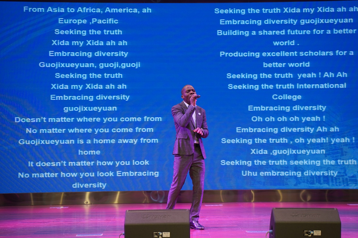 活动现场展示了公司中外师生代表书写院训的书法作品。他们用笔墨挥洒对于公司的热爱,用字里行间的线条与架构表达“真知”与“大同”的深刻内涵。泰国孔敬大学孔子公司中方经理耿军,采用视频的形式展示自己“求真知 谋大同”的书法作品,倡导莘莘学子孜孜追求真知、掌握人类命运共同体应有之义;中国硕士生朱春亭和印尼籍职工刘文才分别展示“求真知,谋大同”小篆作品和行书作品,不同国度的师生用不同的字体表达对院训同样的热爱与认同,体现sunbet申搏“海纳百川,有容乃大”的教育理念。赞比亚籍职工、原创音乐人Gift现场献唱原创主题曲,在歌声中唱到“不管你来自哪里,不论你的肤色如何,让我们为美丽的世界构建一个共同的家园。”