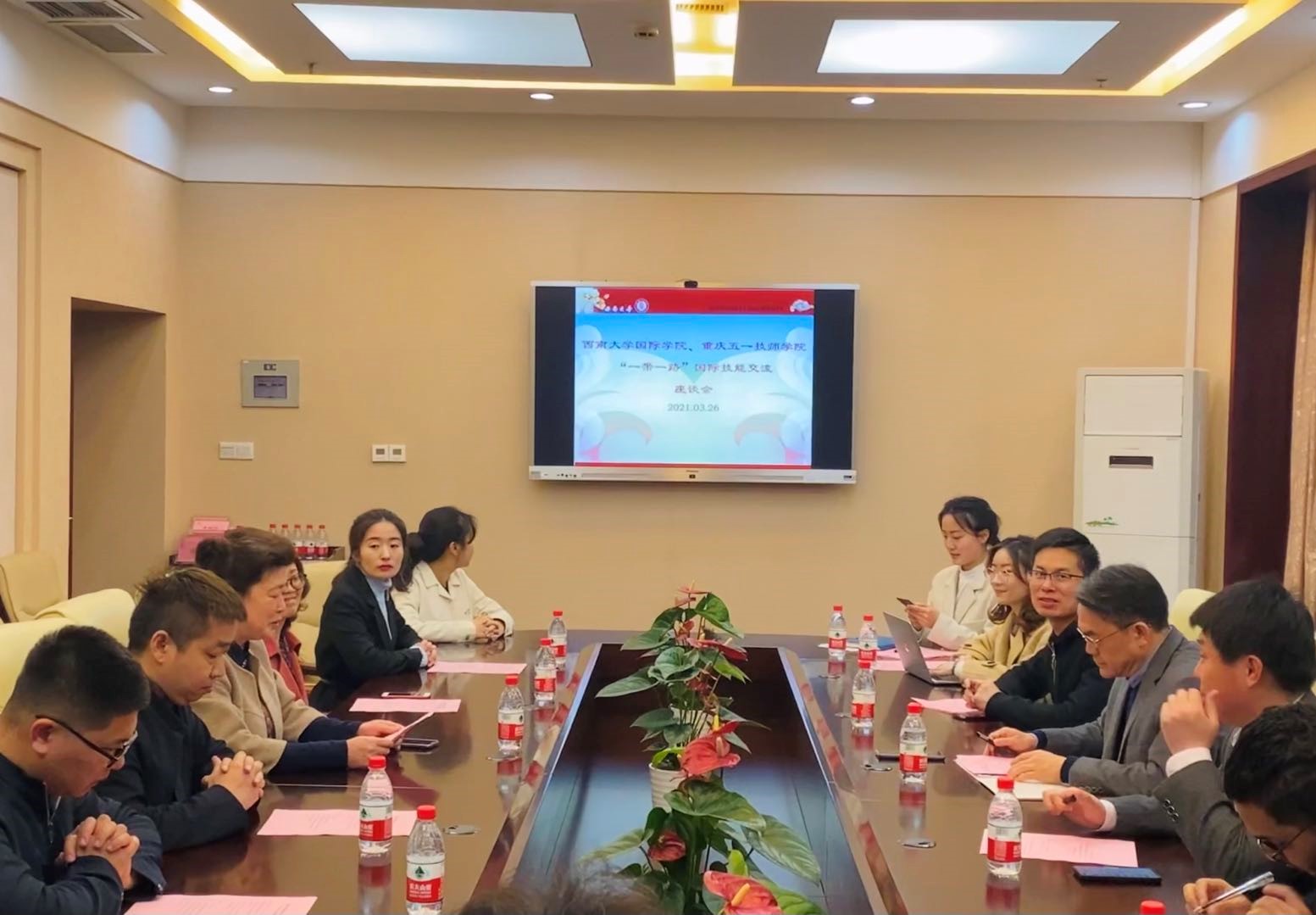 活动开始前举行座谈交流,重庆市教育国际交流协会副秘书长、巡视员张新,公司党总支书记刘猛,历史文化公司 民族公司副经理王勇,五一技师公司国际交流合作中心主任古毅以及中外员工代表等参加会议。会议由张新副秘书长主持。