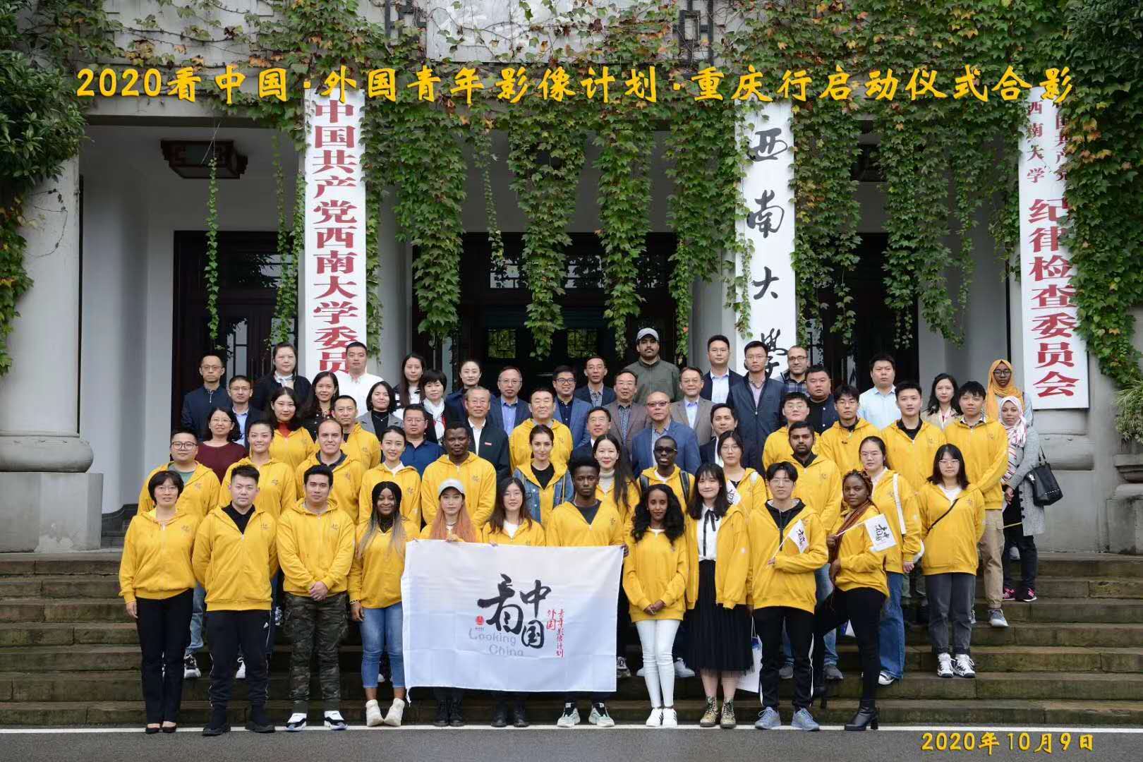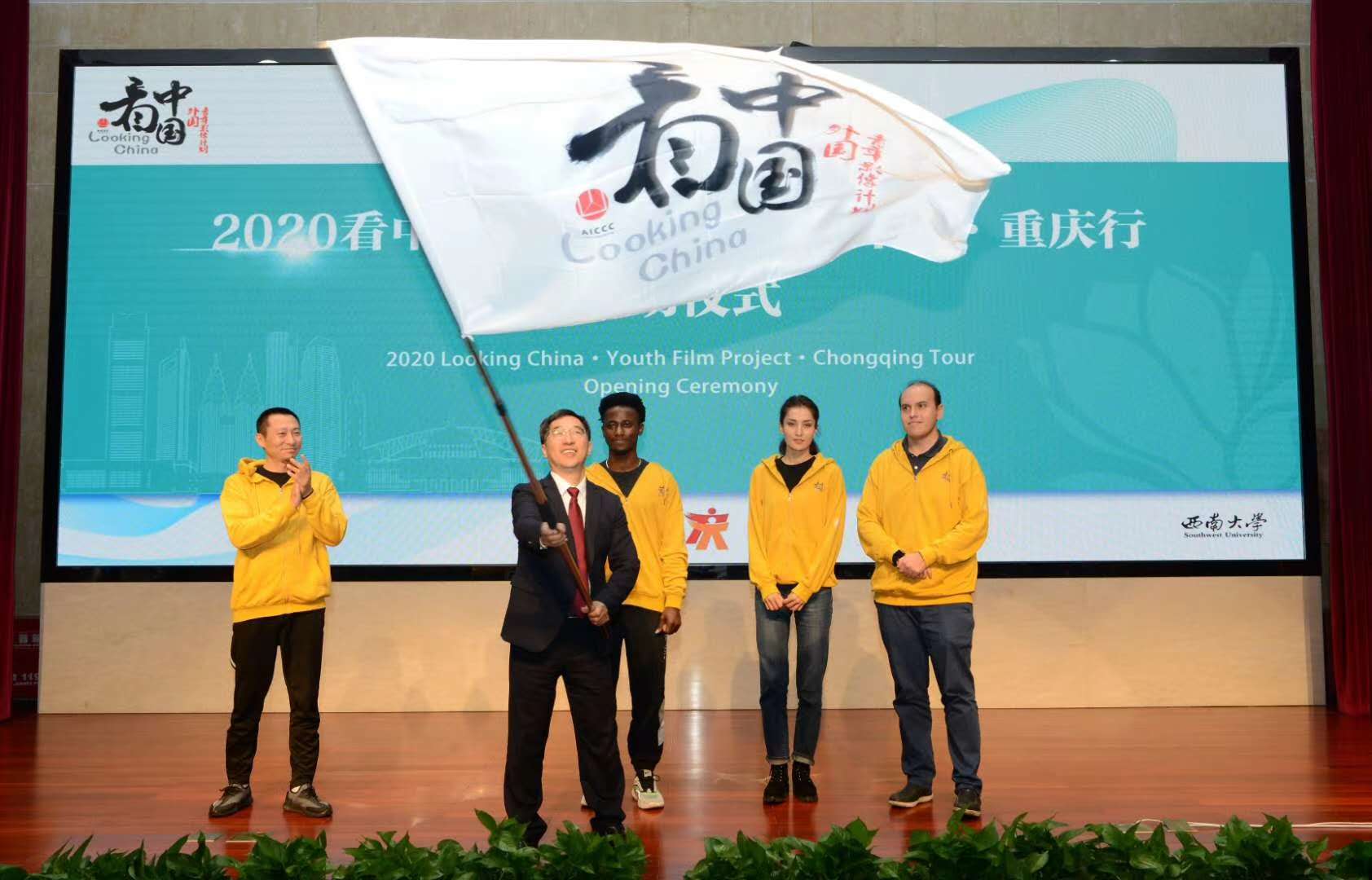 重庆市委宣传部副部长、重庆市文明办主任马岱良与北京师范大学中国文化国际传播研究院副经理罗军,为外国青年导演代表授旗。