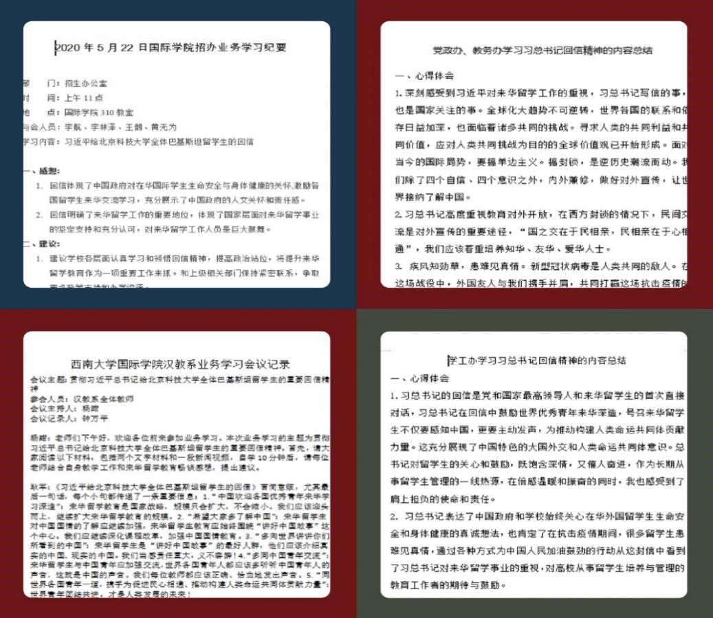 二是召开教职工专题学习会。5月22日,各科室和汉教系由科长、系主任传达习近平总书记重要回信精神,强化主体责任,把学习贯彻回信精神和当前来华留学事业发展、教学改革、服务管理、绩效考核等重点工作有机结合,不断完善规章制度,严格招生审核、过程管理和评审制度,建立规范的管理体系和工作流程。加强教学资源配给和团队管理队伍建设,积极打造来华留学重点项目和精品工程。学习讨论结束后,各科室和汉教系分别撰写了总结报告。