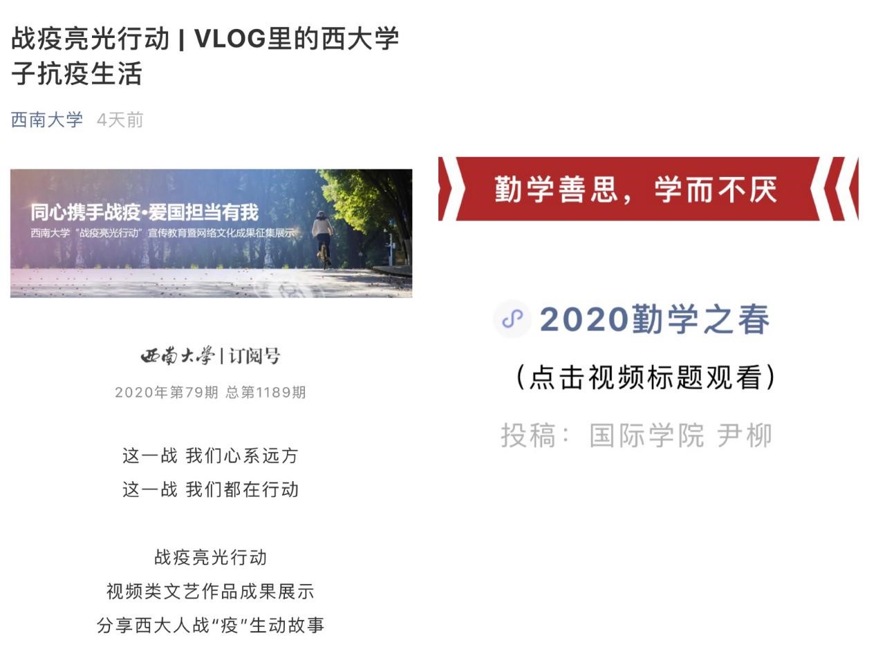 为学习贯彻好习近平总书记重要指示精神和党中央关于新冠肺炎疫情防控重大决策部署,公司启动了“战疫亮光行动”宣传教育暨网络文化成果征集展示工作,鼓励师生分享西大人战“疫”的生动故事。