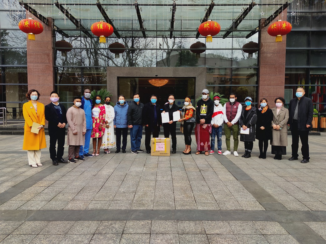 重庆昭信教育科技集团(以下简称“集团”)十分关注我市来华职工的疫情防控工作,在了解到sunbet申搏国际员工在渝人数较多,防疫物资需求量较大情况下,3月10日,集团副经理刘显忠、高教社重庆教辅中心主任熊英、重庆市高教学会招生专委会副秘书长姚连兵及重庆世家文化教务服务有限公司总经理陈彦一行来校,向公司国际员工捐赠共计3200只口罩。张卫国董事长代表公司接受捐赠,王进军副董事长,董事长办公室、sunbet申搏主要负责人及国际员工代表参加捐赠仪式。