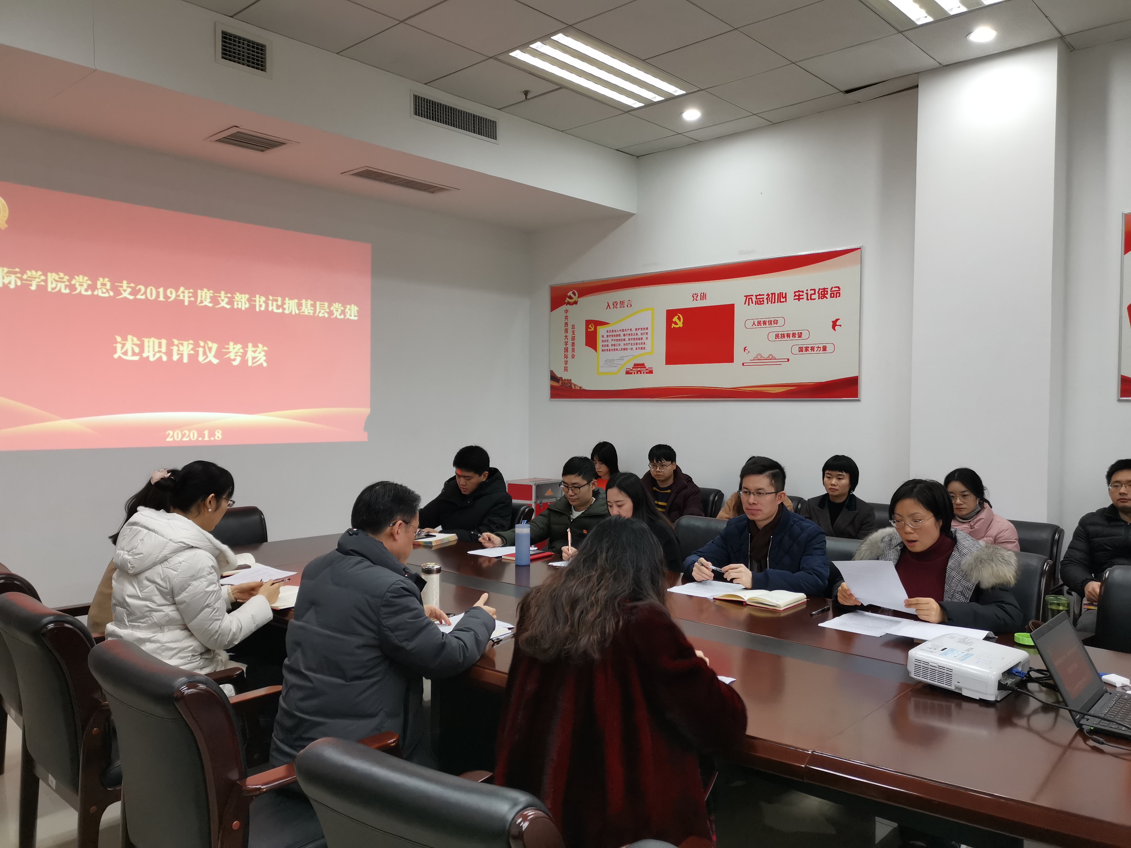 四位支部书记对2019年党支部工作进行了述职报告,刘猛书记逐一进行点评,指出存在的主要问题和今后努力的方向。随后与会人员对四位支部书记进行了现场测评。