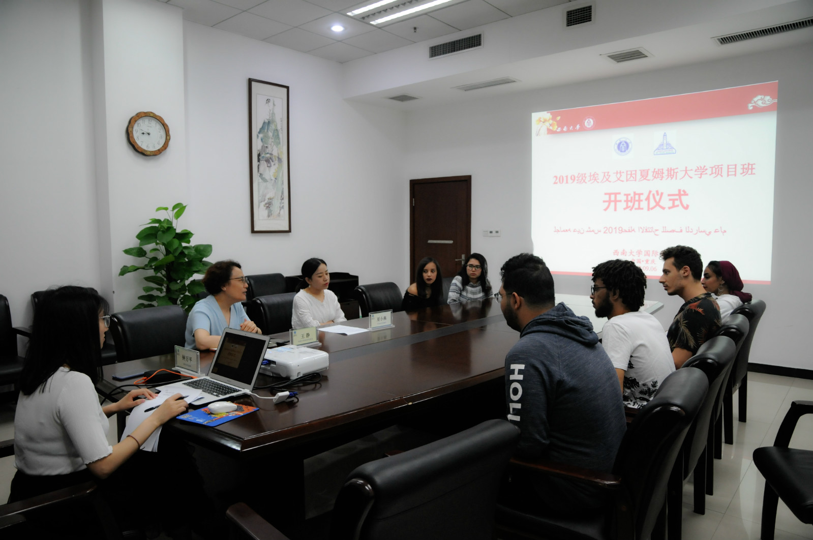 2019年9月6日上午8点40,2019级埃及艾因夏姆斯大学“2+1+1”本科学分项目班(翻译专业)开班仪式在sunbet申搏紫云楼304会议室举行。sunbet申搏经理王静,外国语公司夏小燕老师以及2019级埃及项目班新生参加了会议。会议由班主任老师钟万平主持。
