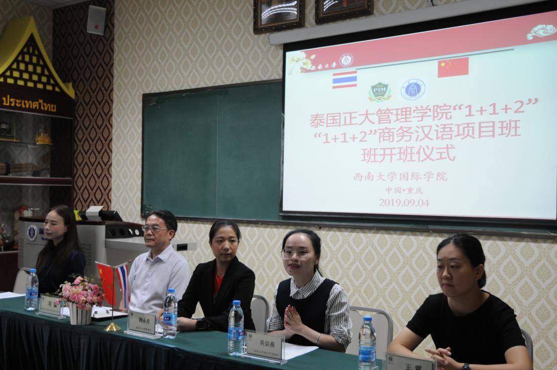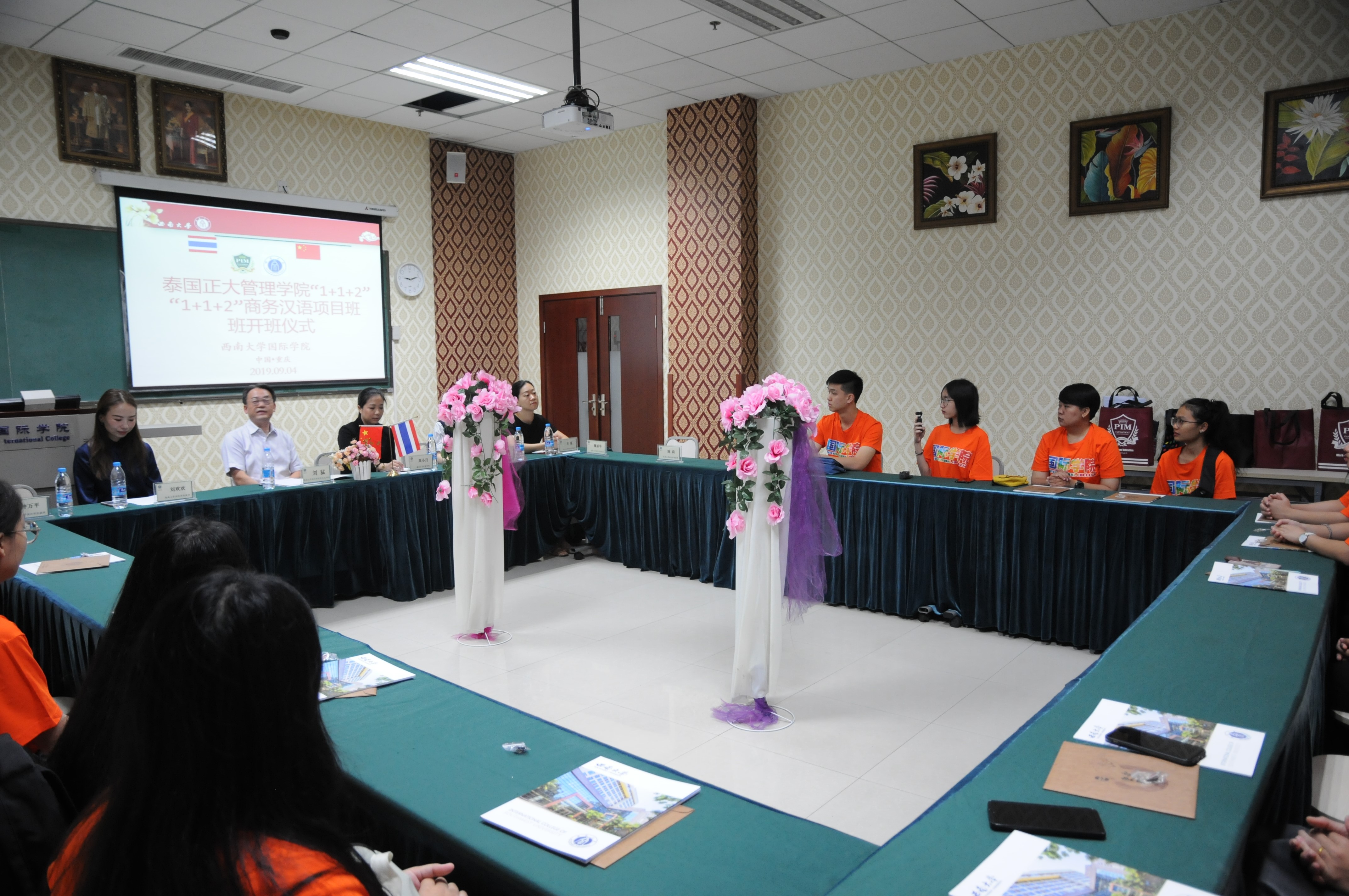 2019年9月4日上午9点,2019级泰国正大管理公司“1+1+2”商务汉语本科项目班开班仪式在sunbet申搏紫云楼泰国文化教室举行。公司党总支书记刘猛,泰国正大管理公司周小月老师,sunbet申搏任课教师代表,2019级泰国正大班新生以及来自公司2019级汉语国际教育硕士的代表参加了会议。会议由班主任老师吴宗燕主持。