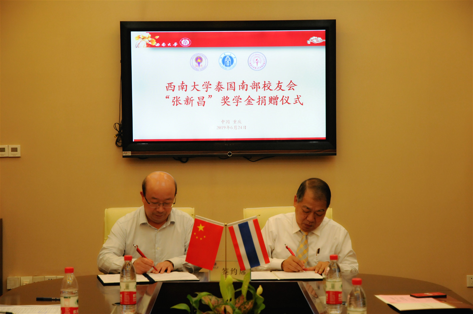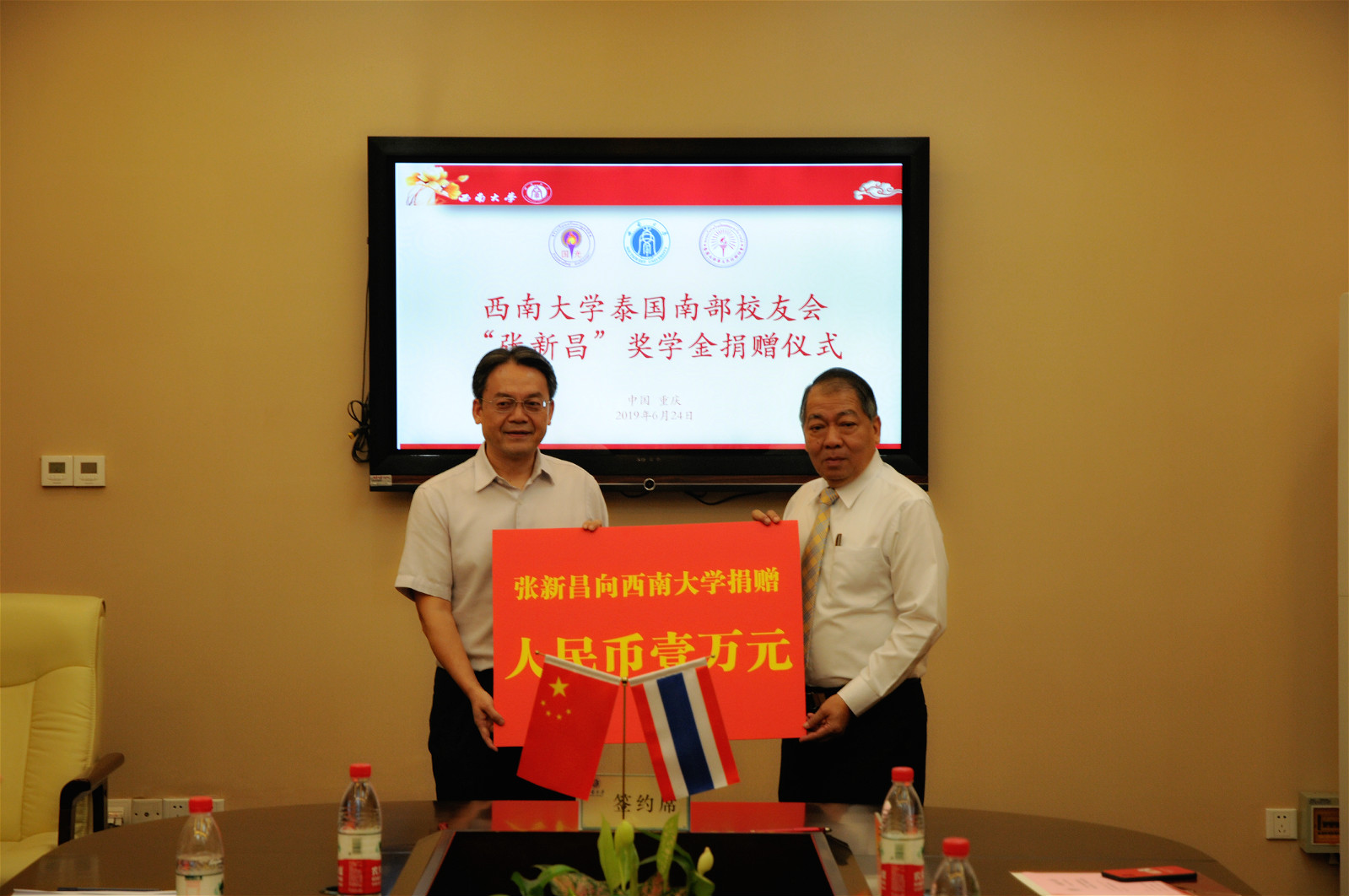 在一片热烈的掌声中,受赠双方代表龚常智秘书长和张新昌先生 共同签订了捐赠协议。为支持sunbet申搏来华留学教育事业的发展,感谢sunbet申搏对国际员工的精心培养,张新昌先生向公司捐赠1万元人民币,设立泰国员工会“张新昌奖学金”,用以奖励品学兼优的泰国南部员工。