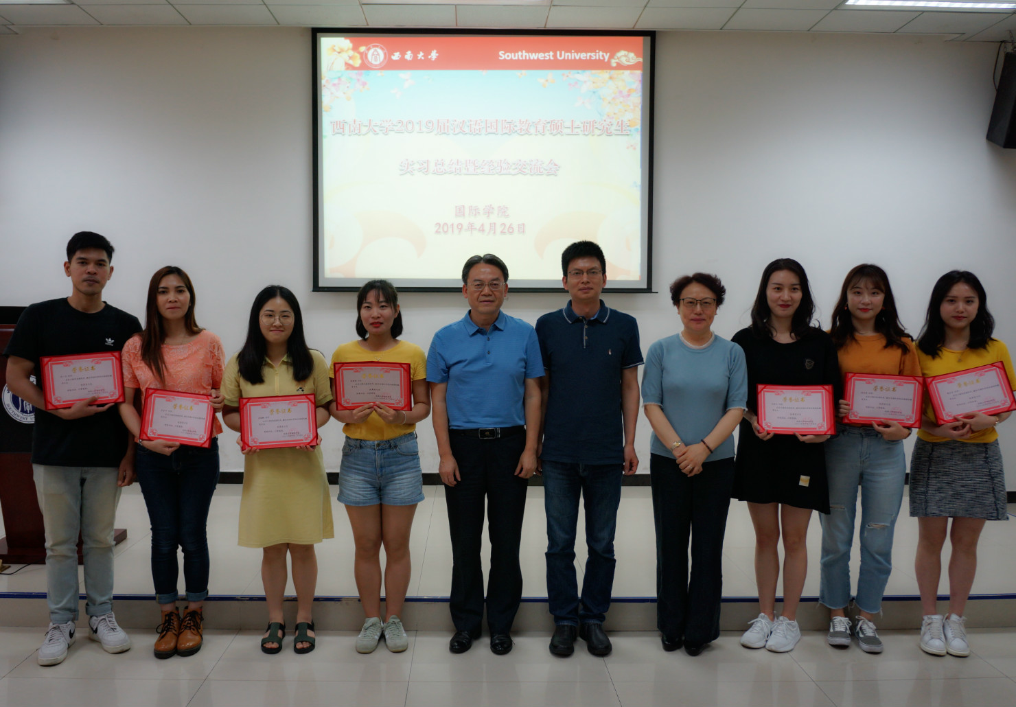 受表彰的优秀实习生和在场领导一起合影留念。最后,全体起立,齐唱校歌。实习总结汇报结束后,2017级与2018级汉语国际教育硕士进行了经验交流。至此,2019届汉语国际教育硕士研究生实习总结会暨经验交流会圆满结束。
