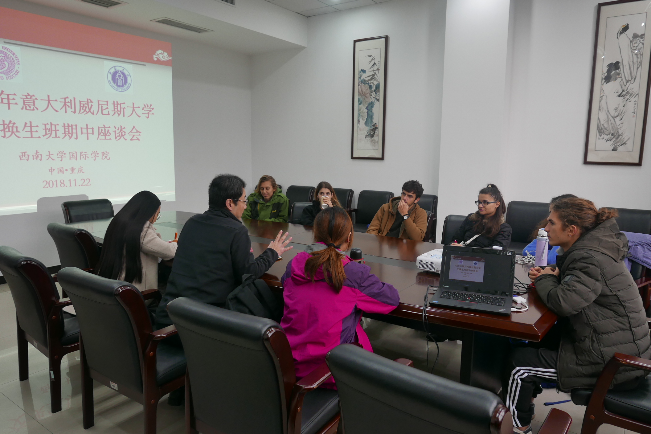 11月22日下午,意大利威尼斯大学交换生班期中座谈会在sunbet申搏紫云楼304会议室举行。副经理李航,教师代表王菁,以及2018年意大利威尼斯大学交换生班部分员工参加了本次座谈。会议由班主任刘妍芩主持。
