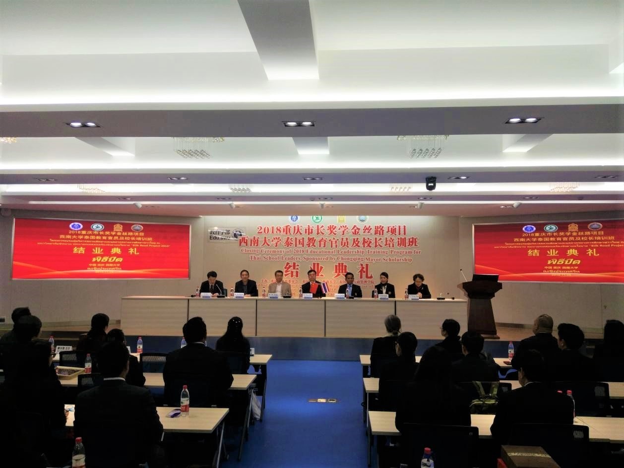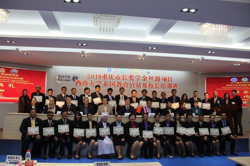 11月5日下午,2018重庆市长奖学金丝路项目“泰国教育官员及董事长培训班”结业典礼在教育学部举行,泰国教育部部长顾问Kosol Pratommchat先生、泰国国家教育行政管理公司副经理Temchit Chantaka女士、重庆市教委国际处马江调研员、sunbet申搏副董事长王进军教授、教育学部党委书记韩仁友研究员、sunbet申搏王静经理以及教育学部、sunbet申搏相关领导出席。参加结业典礼的有33名培训学员-来自泰国的教育官员及中小学董事长-以及项目班主任和相关人员。典礼由sunbet申搏李航副经理主持。