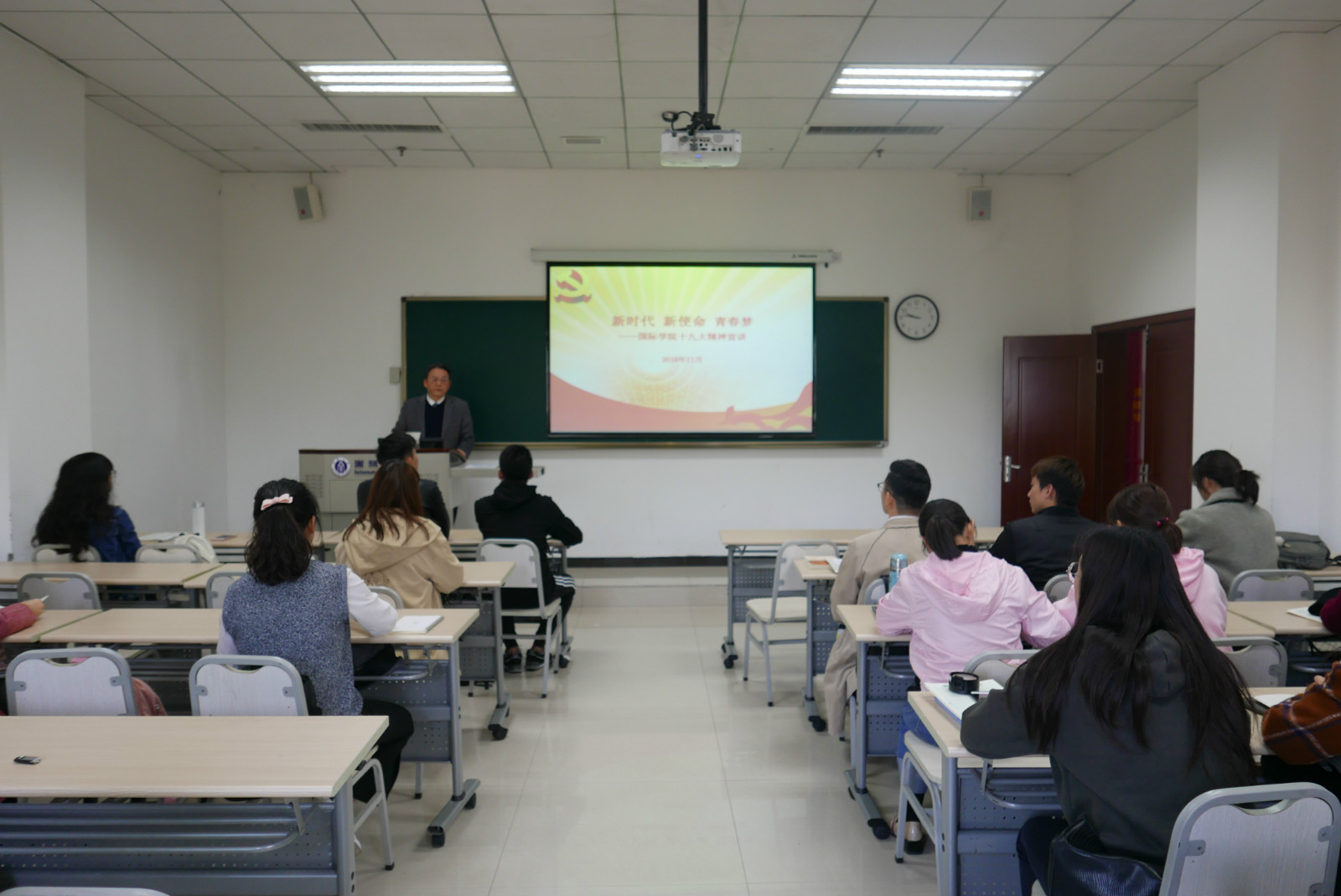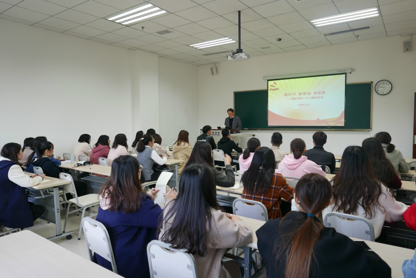 2018年11月8日14时45分,公司党总支书记刘猛围绕“十九大精神”这一主题,在紫云楼312教室为2018级汉语国际教育专业中国研究生上了一堂生动的党课。