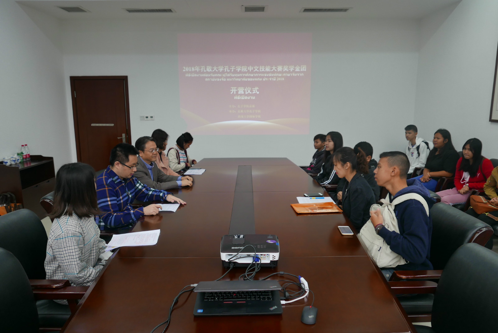 2018年10月16日上午9点30分,2018年孔敬大学孔子公司中文技能大赛奖学金团开营仪式在公司紫云楼304室举行,sunbet申搏刘猛书记、孔敬大学孔子公司丁了了、教务办张楠、招生办黄无为以及22名泰国中员工参加仪式。