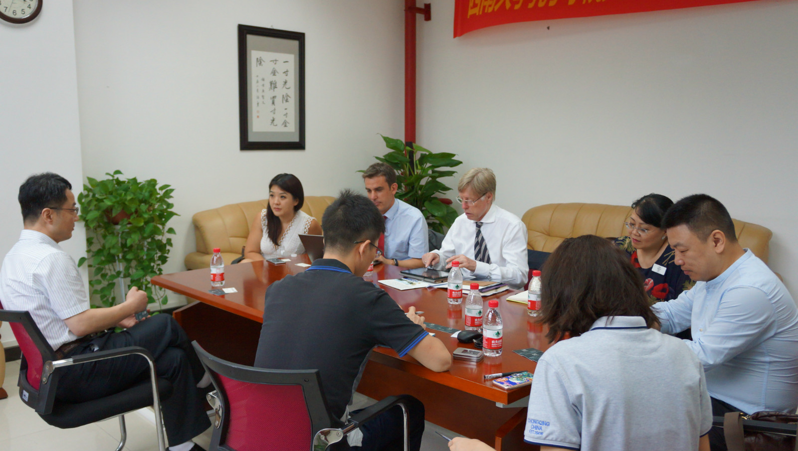 在李林泽的带领下,代表团一行参观了紫云楼教学、会议、办公、住宿等设施设备。在随后的会谈中,双方就选派英国员工来公司参加国际员工夏令营、为英国员工定制来公司短期学习项目等进行了详细商谈。会谈结束后,双方互赠礼物并合影留念。