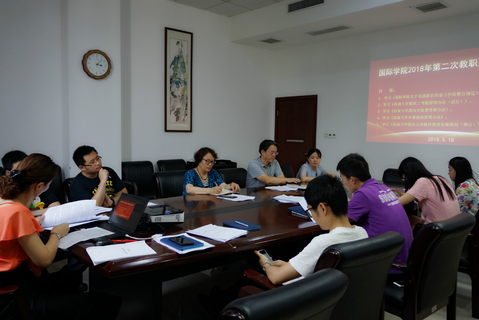 随后,办公室主任邹育艳带领大家重新学习了《sunbet申搏教职工考勤管理办法(试行)》、《sunbet申搏国内差旅费管理办法》以及新修订的《sunbet申搏外事接待管理办法》、《sunbet申搏国内公务接待管理实施细则(修订)》,大家共同了解与日常工作息息相关的考勤办法和财务知识。