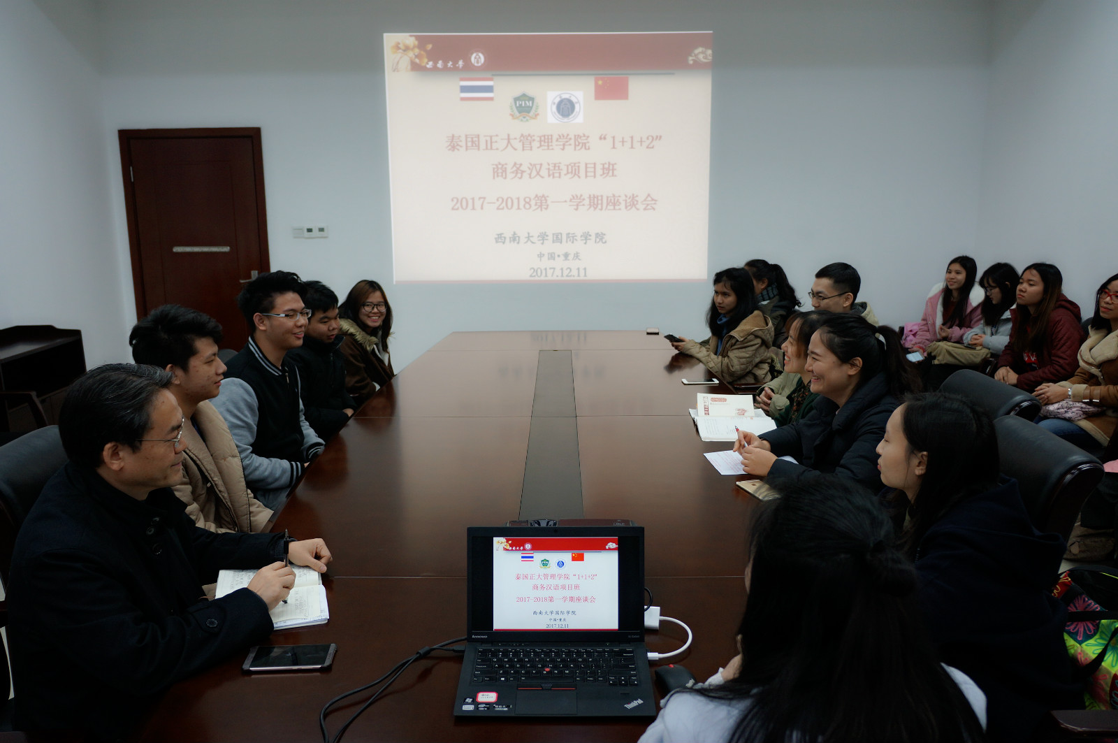 12月11日下午四点半,2017级泰国正大管理公司员工学期座谈会在sunbet申搏304会议室圆满举行。公司党总支书记刘猛,正大管理公司项目班的5名任课教师以及14名泰国员工参加会议,座谈会由吴宗燕主持。