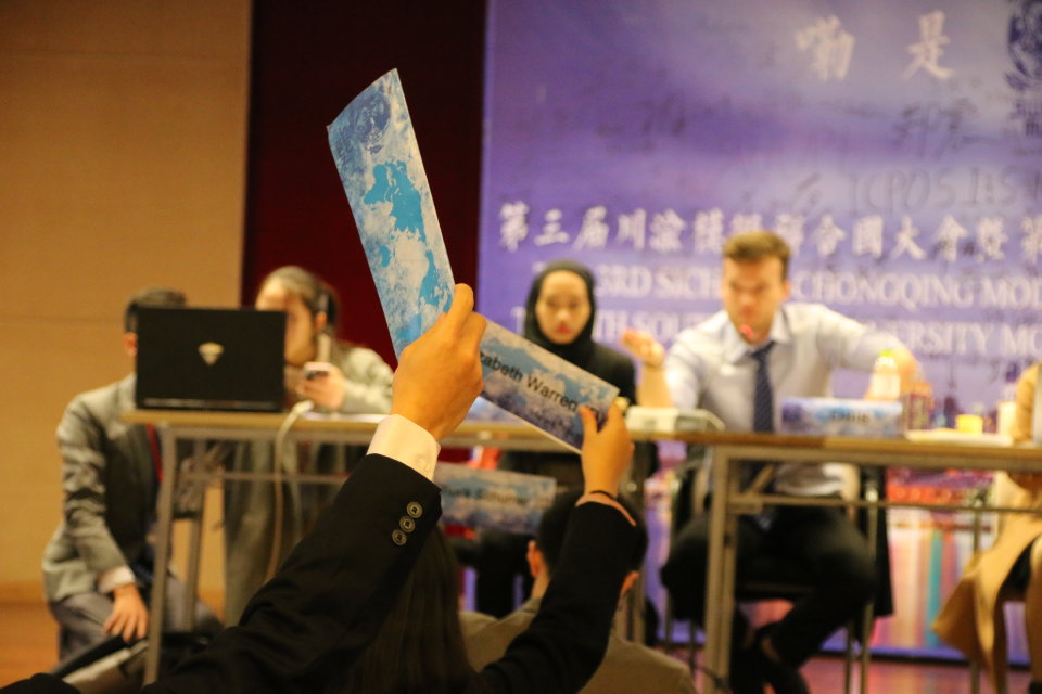 第三届川渝模拟联合国大会暨第五届sunbet申搏模拟联合国大会于12月1日至3日在公司举行,sunbet申搏员工工作办公室主任陈雨曦在大会开幕式上致辞。本次会议吸引了来自重庆大学、电子科技大学、四川外国语大学等15所公司的近200名中外青年代表,以及来自武汉大学、上海师范大学、江西财经大学、西南政法大学的5位校外模拟联合国协会主席参会。