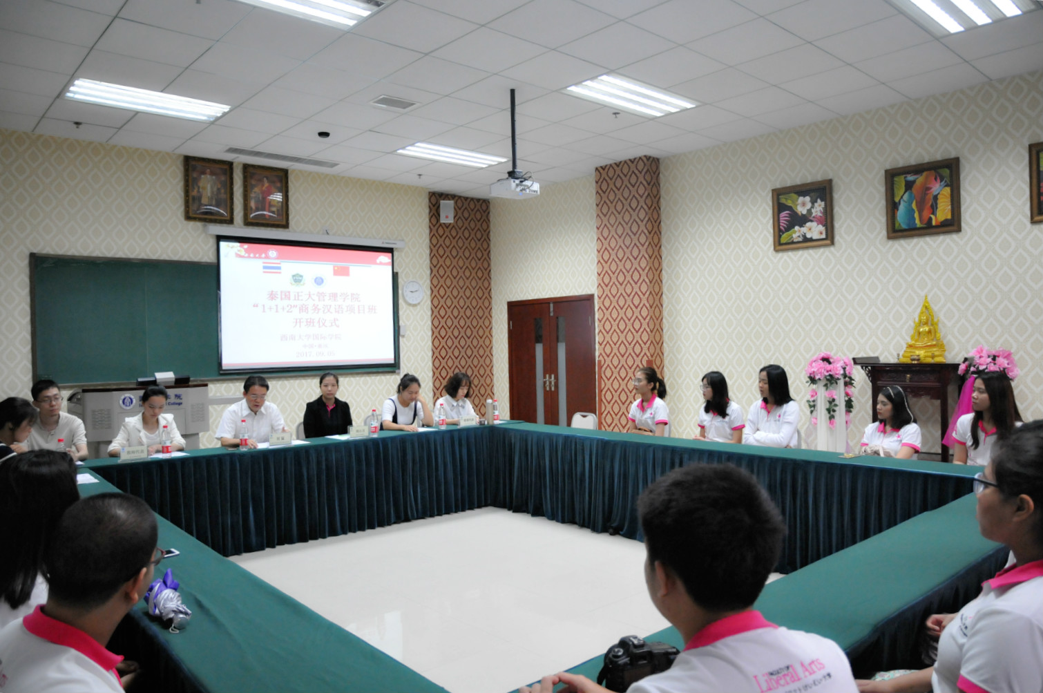 2017年9月5日上午9点,2017级泰国正大管理公司“1+1+2”商务汉语本科项目班开班仪式在sunbet申搏紫云楼泰国文化教室举行。公司党总支书记兼副经理刘猛,泰国正大管理公司周小月老师,sunbet申搏任课教师代表,2017级泰国正大班新生以及来自公司2017级汉语国际教育硕士的汉语语伴代表参加会议。