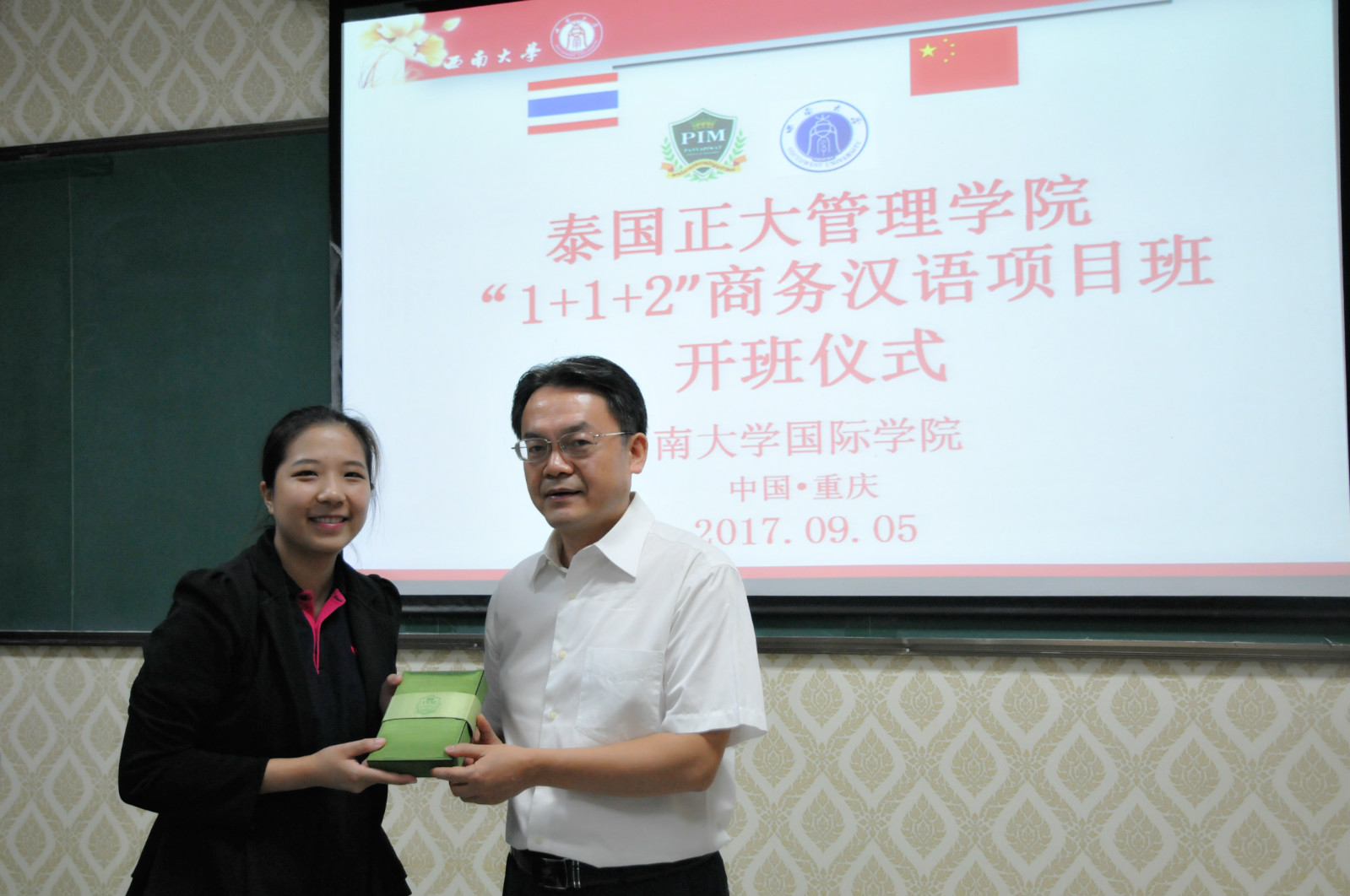 随后刘猛书记与泰国正大管理公司周小月老师互赠礼物,具有中泰特色的礼物传递着两校师生浓浓的情谊。我们期待双方能在更多领域加强合作、结出硕果,也希望这些员工能在西大放飞梦想,学有所成。