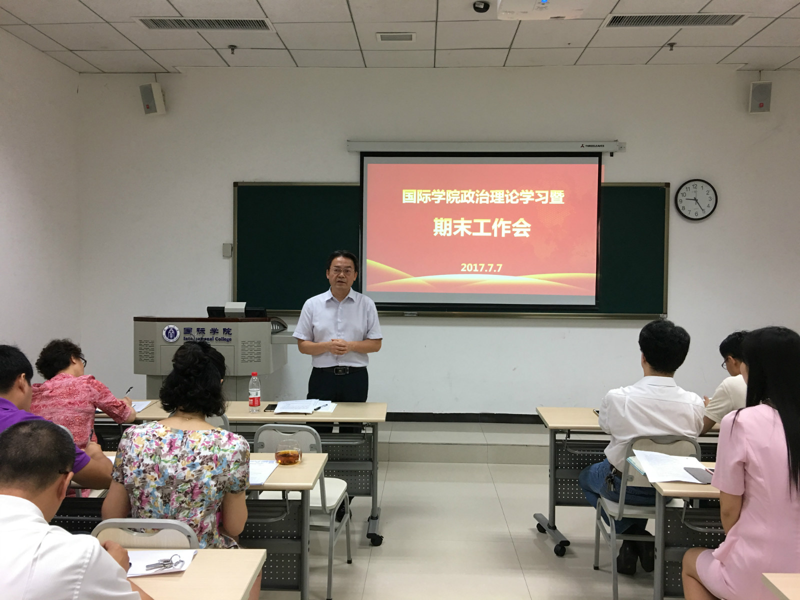刘猛书记对假期各项工作的时间节点做了说明,对暑期工作做了布置,对安全稳定工作、值班要求等事项做了强调。李航副经理对招生和教学工作进行了补充说明。王静经理做总结发言,她对各部门的工作表示肯定,对公司绩效工资实施办法进行了通报,对下学年因工作或个人原因需要离开公司的同志表达了感谢和祝福。
