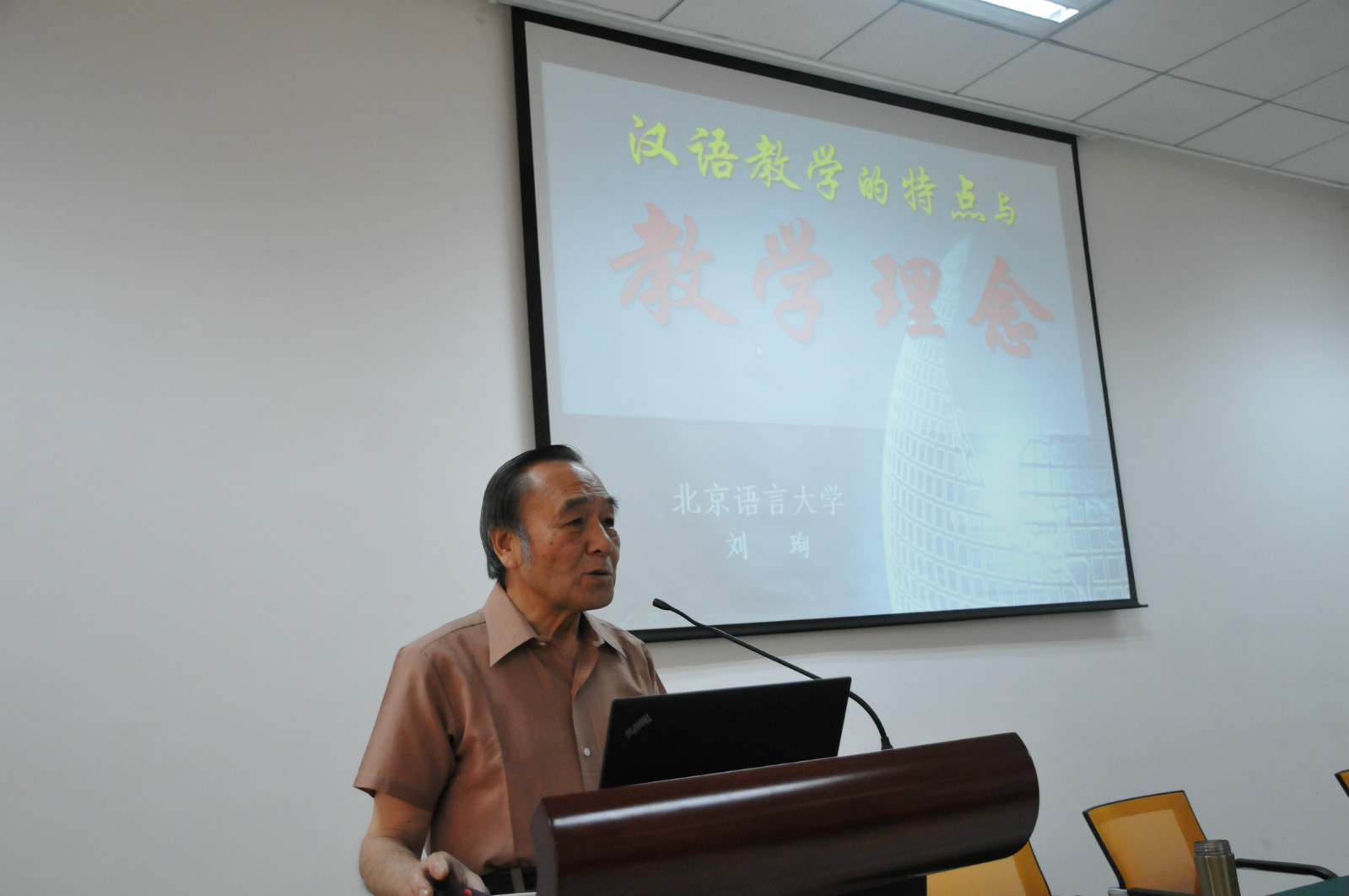 紧接着,他从个人与学科两个角度阐述了掌握汉语教学法知识、研究教学法的重要性。整个讲座重点就“重视语言教学的共性,研究汉语教学的特性”“运用辩证法思维对待教学中的各种因素和矛盾”“语言教学的十大原则”“‘结构——功能——文化’三结合教学理念的教材实践”等四个方面展开。