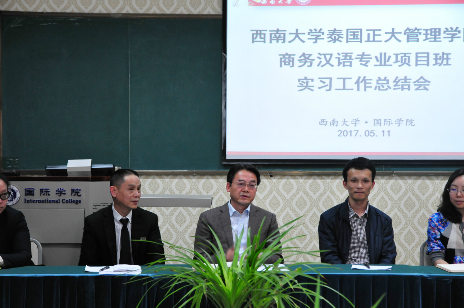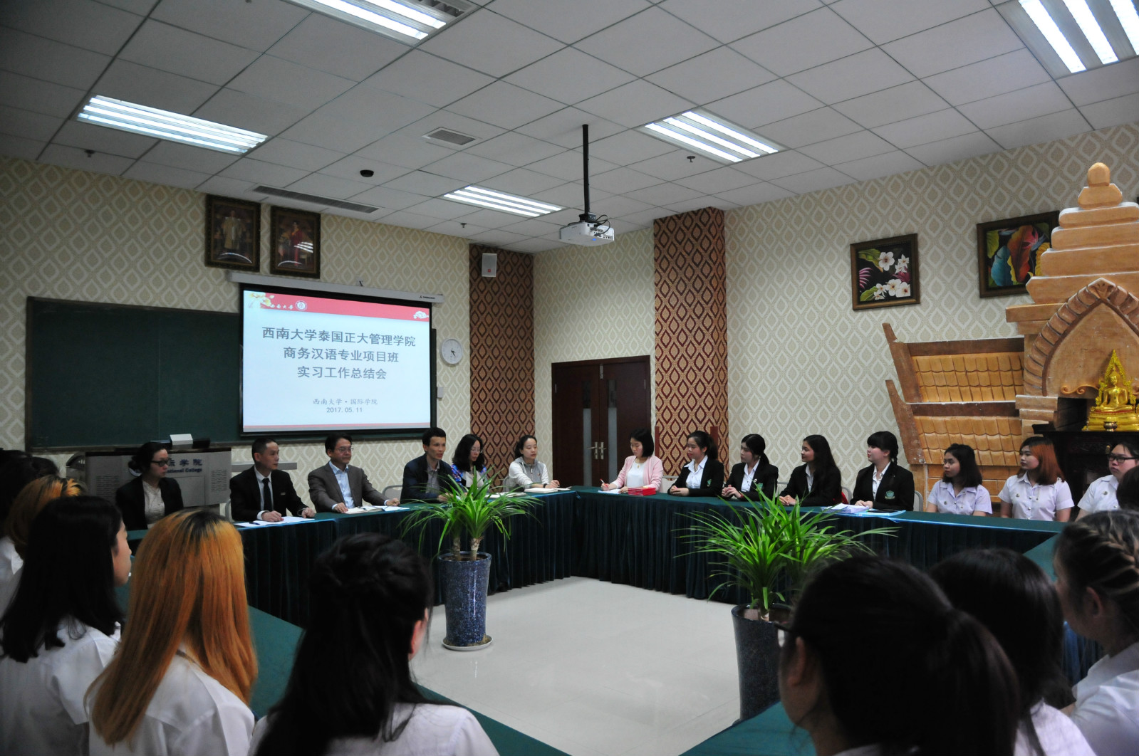 2017年5月11日下午15:00,泰国正大管理公司商务汉语项目班实习工作总结会在sunbet申搏泰国文化教室举行,公司党总支书记刘猛,图书馆副馆长章雷,以及后勤集团接待中心主任肖先勇等相关负责人参加会议。