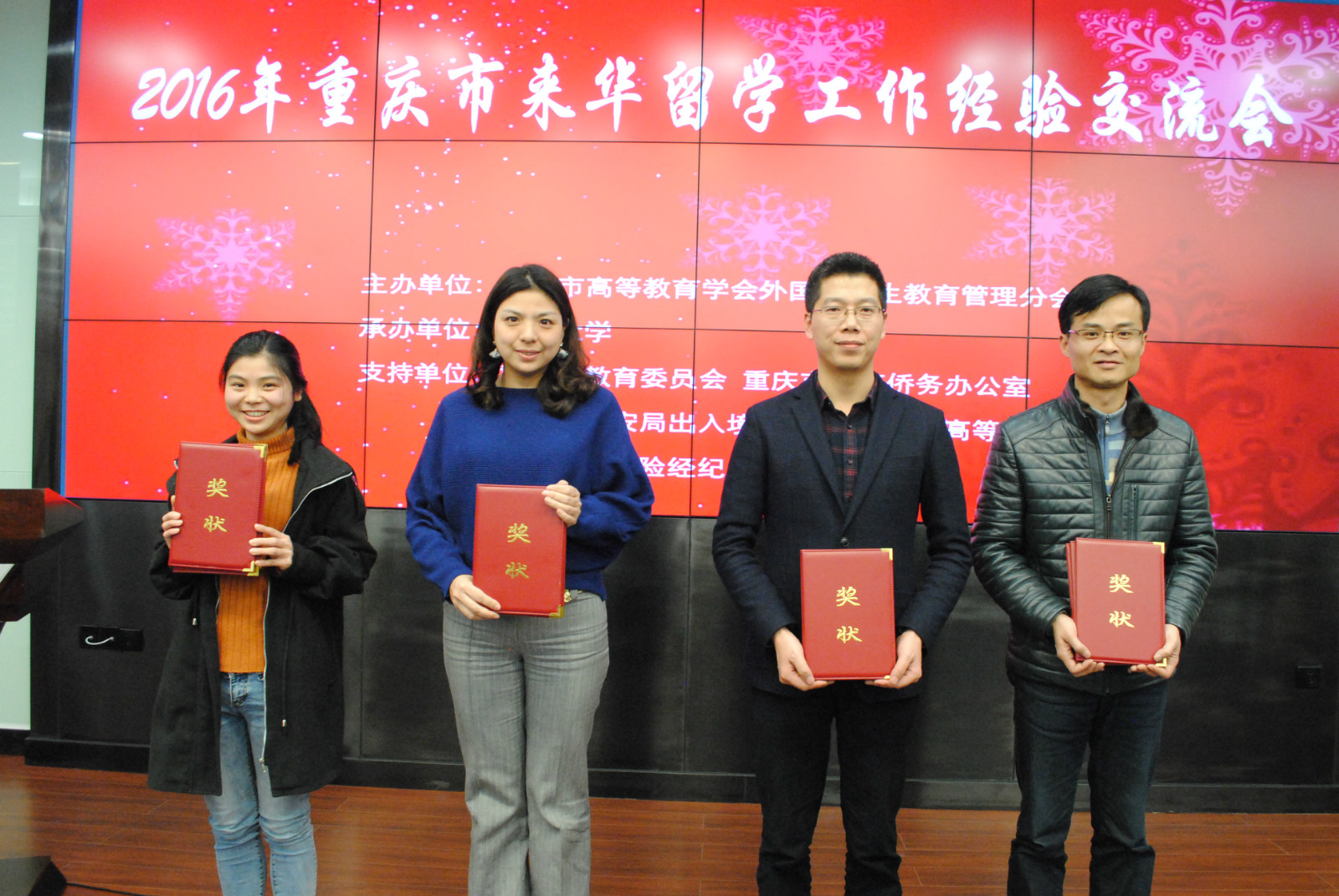 在颁奖环节中,公司荣获高校留管干部业务知识竞赛二等奖以及优秀组织奖。代远鸿、陈雨曦、陈钊、邹育艳四位老师获得2016年度重庆市来华留学先进个人荣誉称号。
