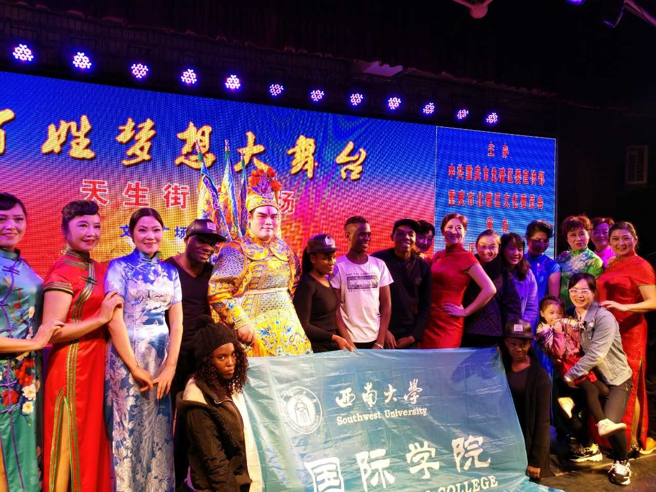 11月10日晚上7点,北碚区“百姓梦想大舞台天生街道专场演出”正式拉开序幕。公司来自泰国的罗俊勇、赞比亚的GIFT等七位同学受邀参加表演,和近百名北碚天生街道的群众们同台亮相。