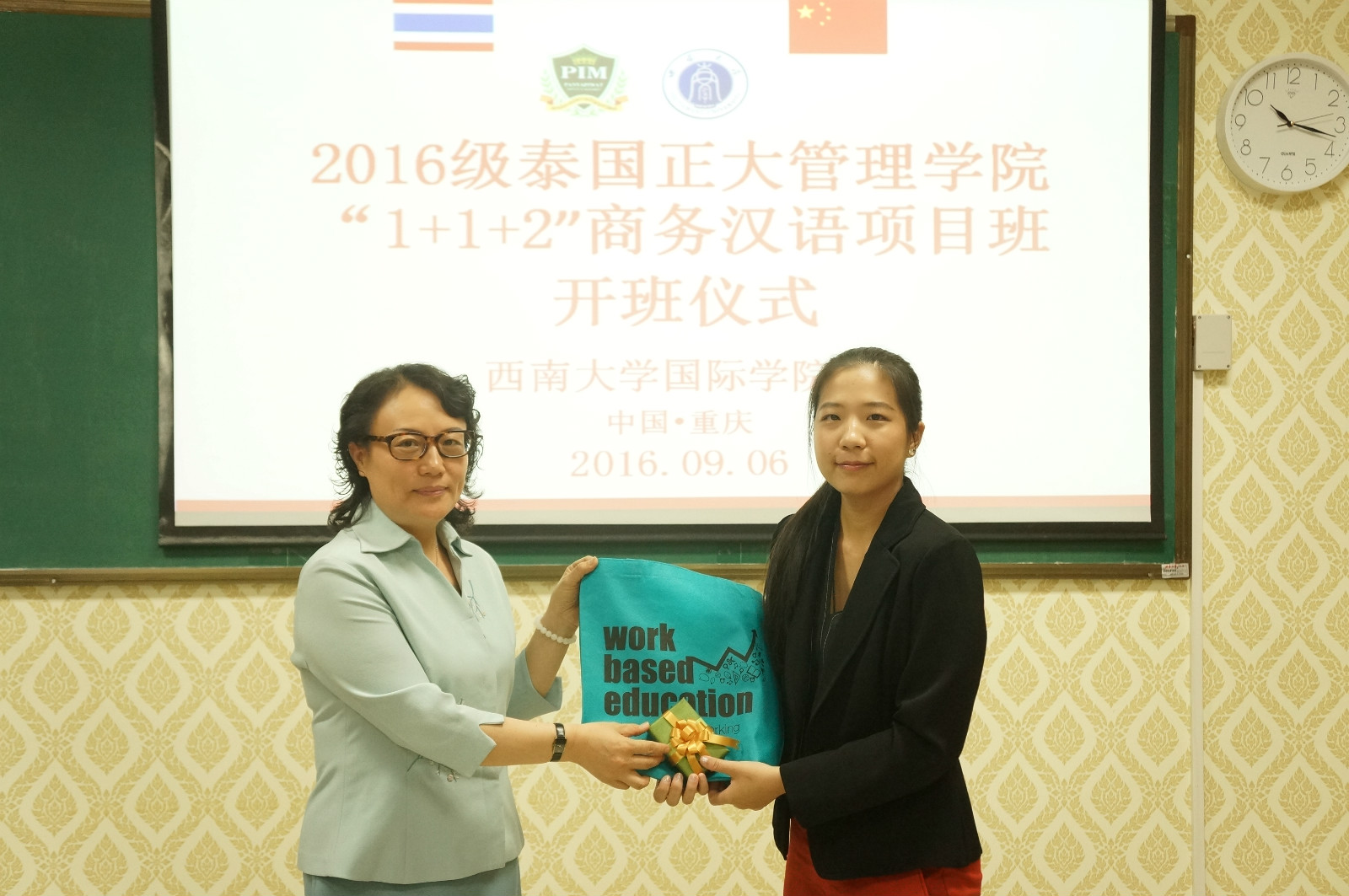 2016年9月6日上午10点,2016级泰国正大管理公司"1+1+2"商务汉语本科项目班开班仪式在sunbet申搏紫云楼泰国文化教室举行。王静经理、刘猛书记,泰国正大管理公司周小月老师,sunbet申搏任课教师代表,2016级泰国正大班新生以及来自公司2016级汉语国际教育硕士的汉语语伴代表参加了会议。
