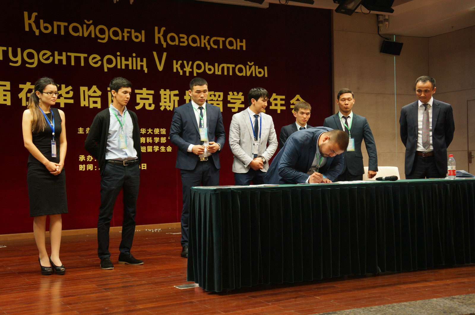 随后,来自北京、上海、广州、武汉、西安、乌鲁木齐以及重庆的哈萨克斯坦职工代表纷纷上台发言,针对在华学习、生活等诸多方面进行了深入的探讨并在支持年会的协议上签下了自己的名字。年会在参会领导与哈萨克斯坦留学会代表的合影中圆满落幕。