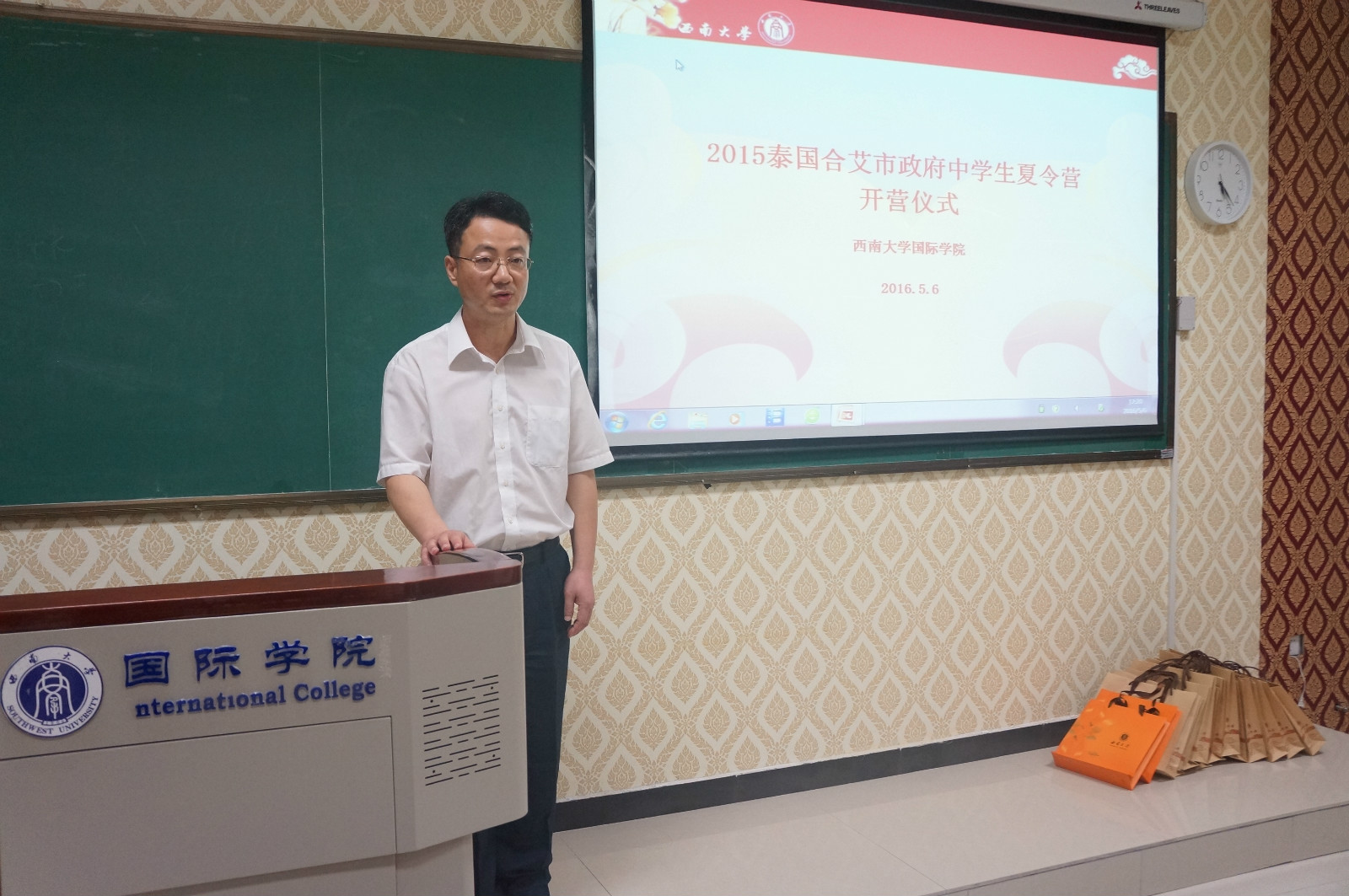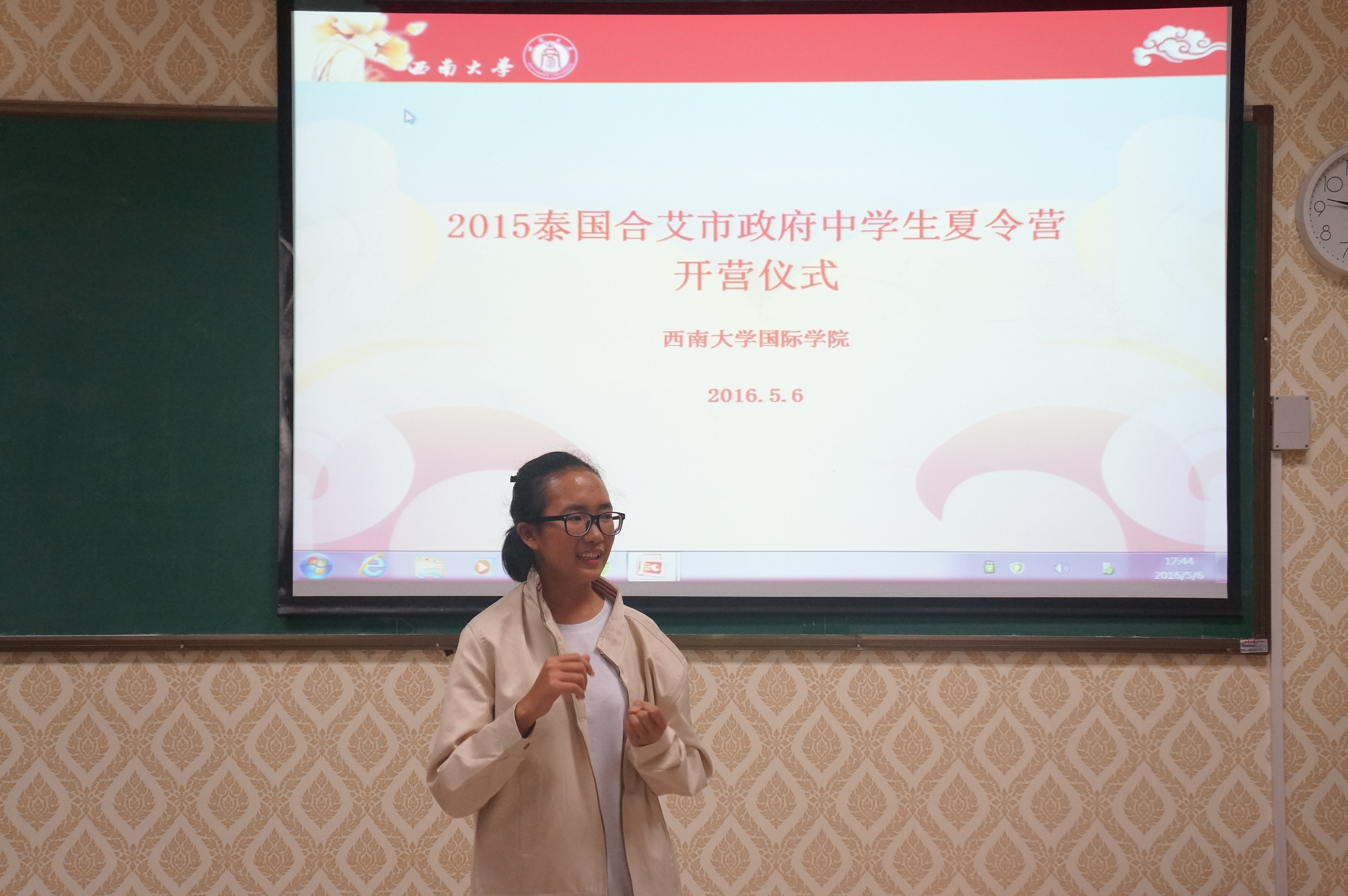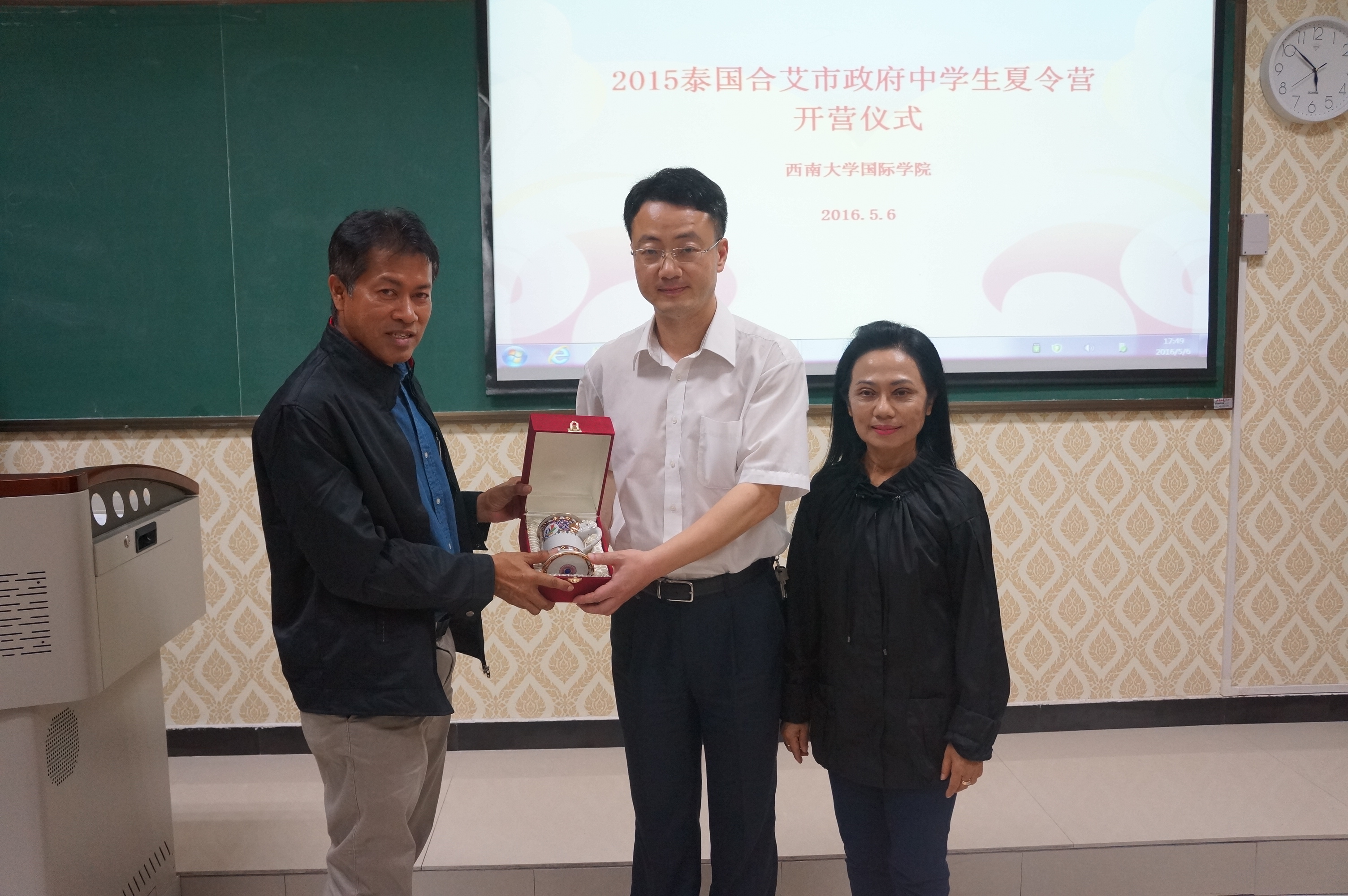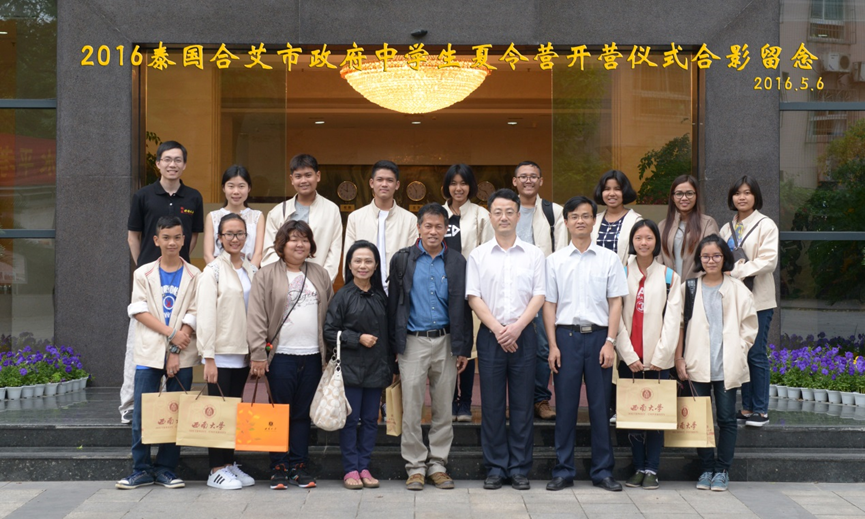 5月6日下午5时,2016泰国合艾市政府中员工夏令营开营仪式在sunbet申搏紫云楼举行。sunbet申搏副经理李航、外国员工招生办公室主任代远鸿、泰国合艾市政府副市长SUMRIT BOONRAT先生、泰国合艾市教育局局长SUTASNAN NIAMRAT女士、以及教师代表和全体学员参加了本次开营仪式。