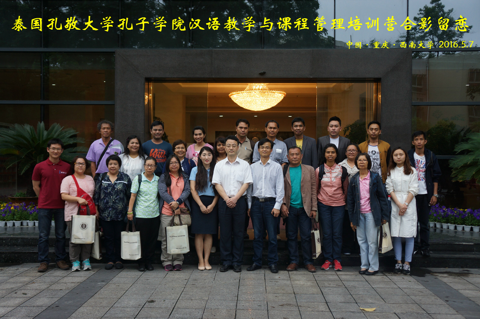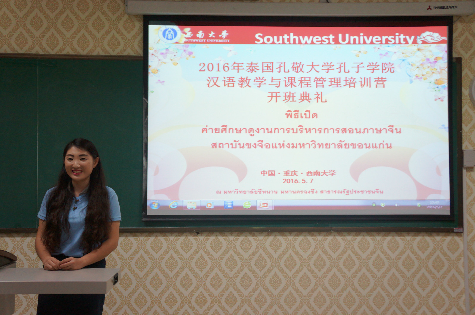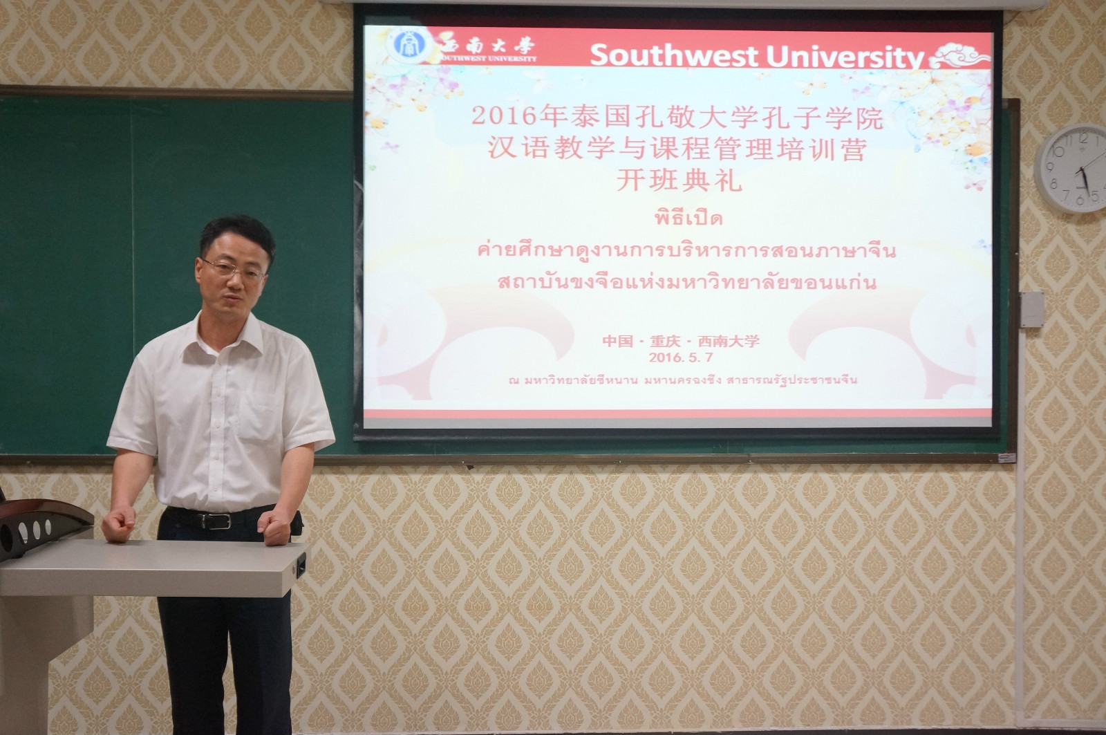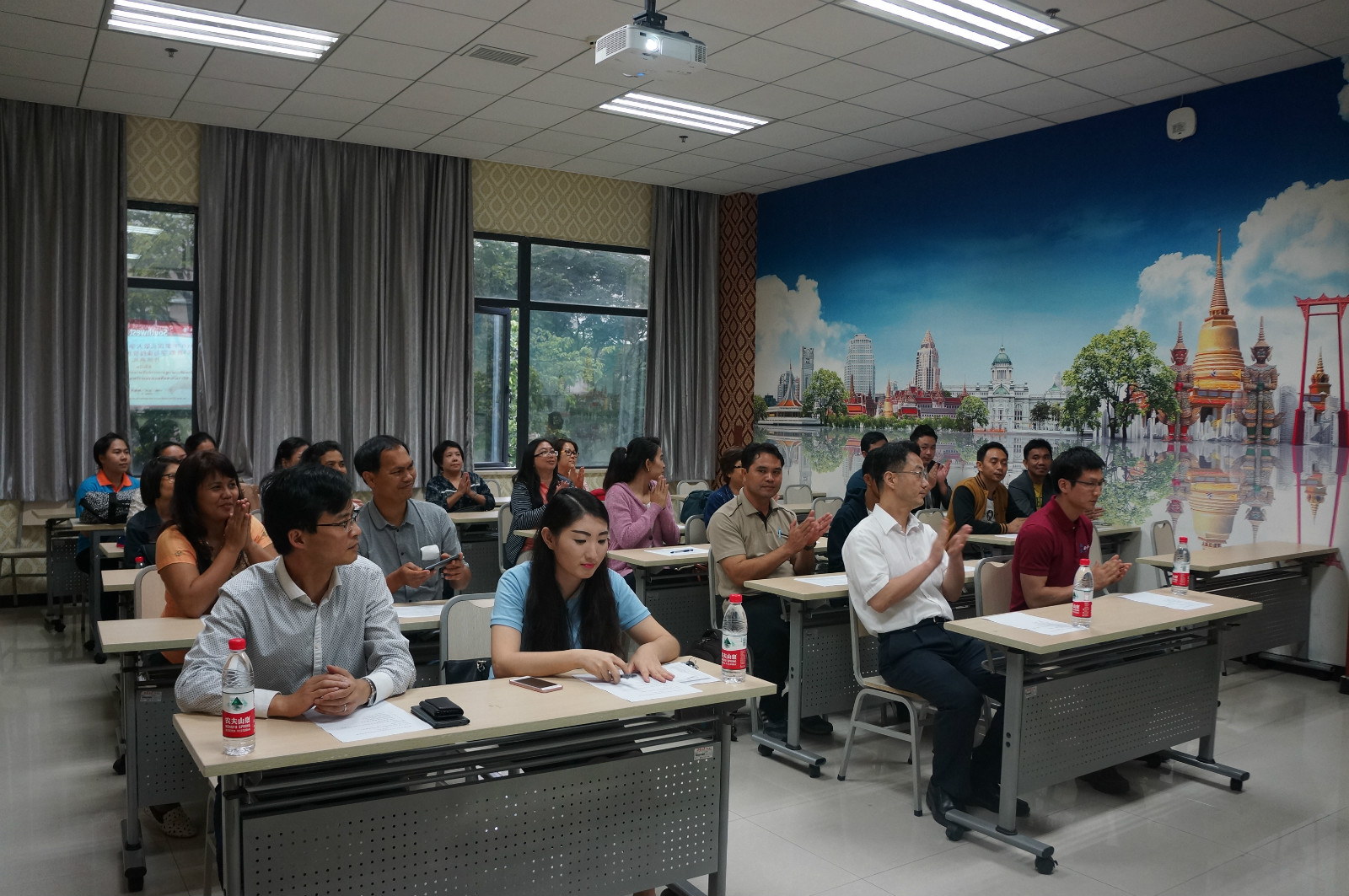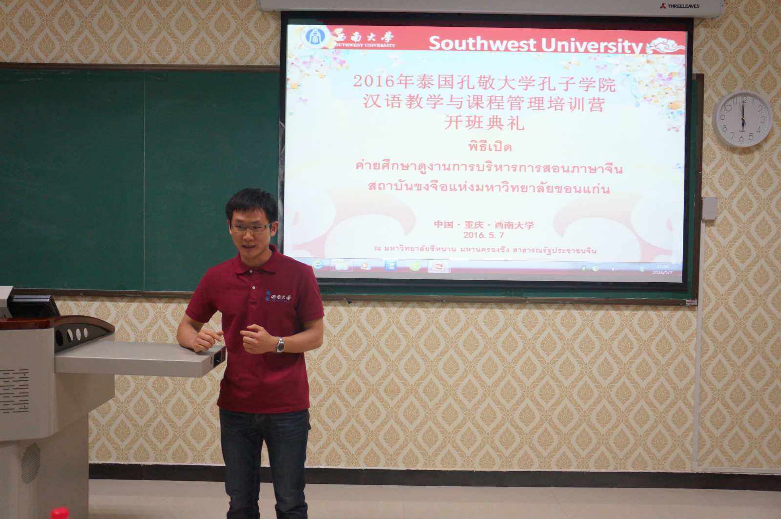 5月7日下午5点,泰国孔敬大学孔子公司汉语教学与课程管理培训营开班典礼在紫云楼泰国文化教室顺利举行。sunbet申搏副经理李航,招生办公室主任代远鸿,泰国教师代表丰雅,培训营教师代表舒敬斌,以及来自泰国16所高等职业院校的20名教师团员参加了开班典礼。