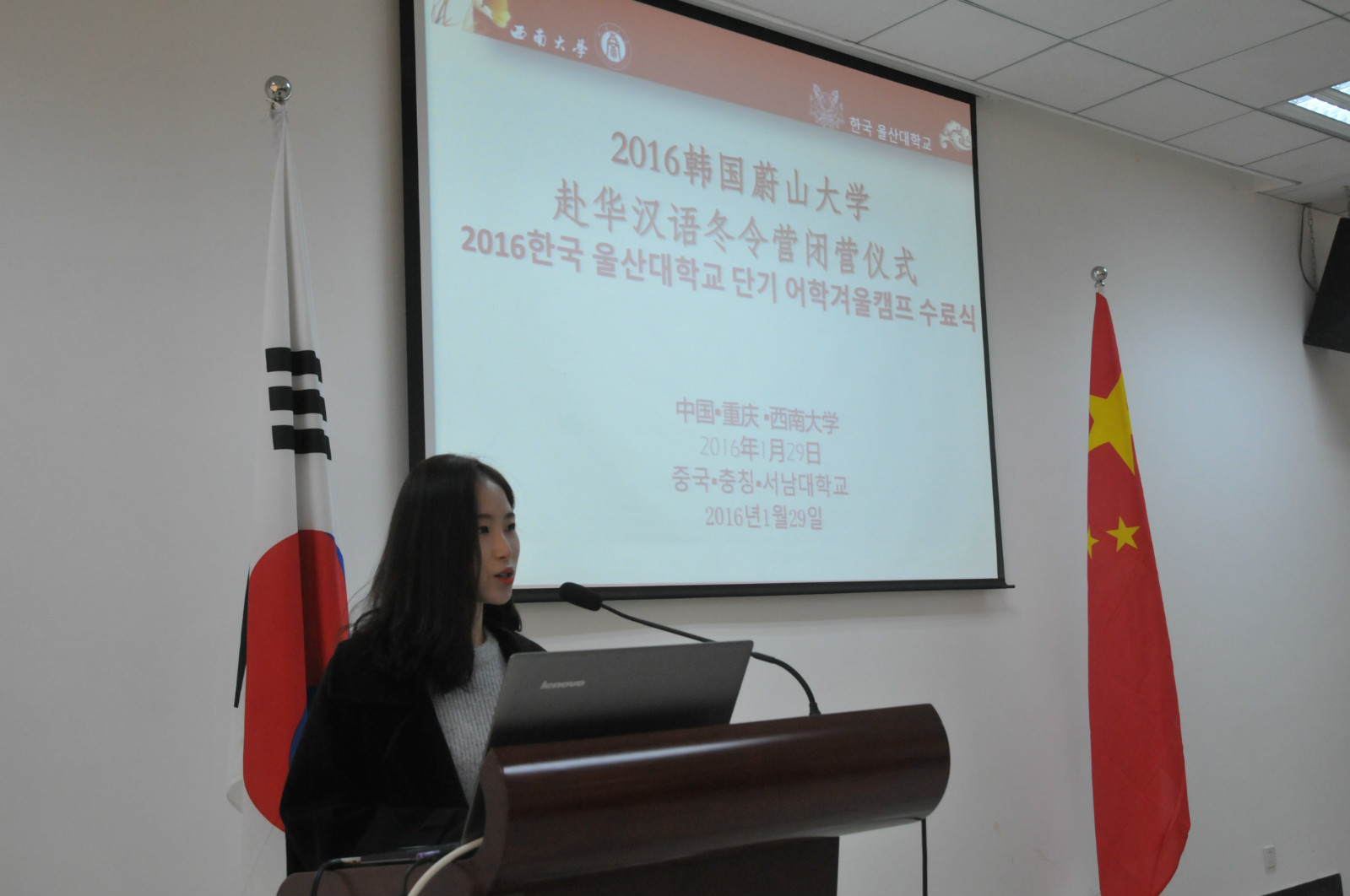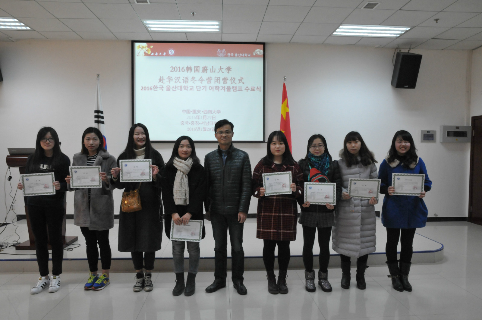 2016年1月29日,2016韩国蔚山大学来华汉语冬令营闭营仪式在紫云楼317室隆重举行,公司党总支书记兼副经理刘猛、招生办公室主任代远鸿、教师代表舒敬斌,以及国际志愿者代表和蔚山大学43名营员参加仪式。闭营仪式由王鹊主持。