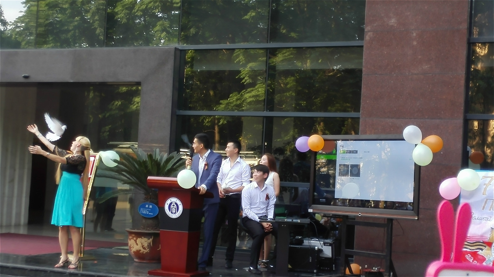 职工合唱团还演唱了俄罗斯歌曲《喀秋莎》,他们的精彩表演将现场气氛推向了高潮。最后,在悠扬的音乐声中,大家陆续上前敬献鲜花和蜡烛,放飞手中的白鸽,以此来表示对革命烈士的无限崇敬以及对世界和平的珍视和美好希冀。