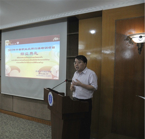 张家政副经理在致辞中表示,结业典礼令人既感到高兴又有点不舍,同时还有点令人嫉妒。高兴的是迎来了以亚索通职业技术公司前任经理阿敦德先生为代表的泰国职业教育界的新老朋友;不舍的是职业技术公司的高铁人才储备项目的同学们将结束在华的汉语培训营回国;嫉妒的是在该项目同学们即将回国之际,所在公司的领导特意前来参加结业典礼,对各位同学的关爱和对同学们未来职业发展的关注可见一斑。希望学员们回国后能继续学习汉语,学好汉语,为今后服务泰国高铁项目做好准备,希望大家能像高铁一样,架起和维护中泰友谊和交流的桥梁。