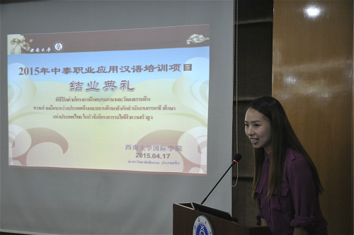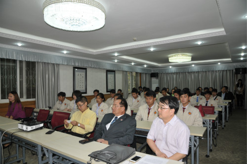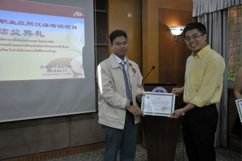 4月17日下午5点,2015年中泰高铁汉语培训项目结业典礼在公司职工公寓1-1会议室举行。sunbet申搏经理张发钧、副经理张家政、教师代表,泰国孔敬大学孔子公司中方经理王贵斌,培训项目全体成员,以及泰国十余所职业公司的近20名经理参加结业典礼。典礼由李林泽主持。