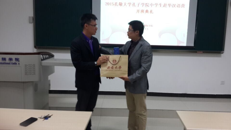 最后张经理为泰国领队老师赠送礼品,全体师生在紫云楼一楼合影留念。开班典礼圆满结束。
