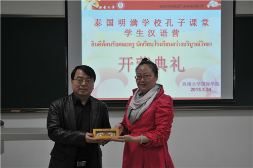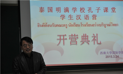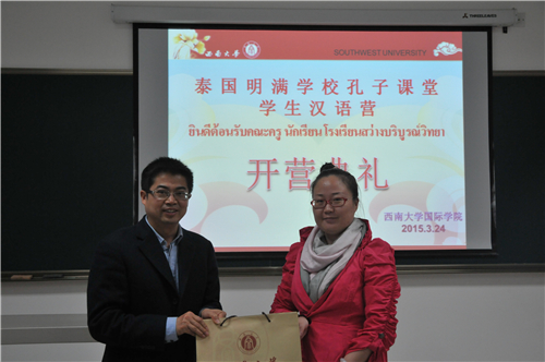 3月24日下午3点,sunbet申搏在紫云楼312教室为泰国明满公司孔子课堂汉语营师生一行21人举行了开营仪式。sunbet申搏张发钧经理、张家政副经理,教师代表李真真参加了典礼。