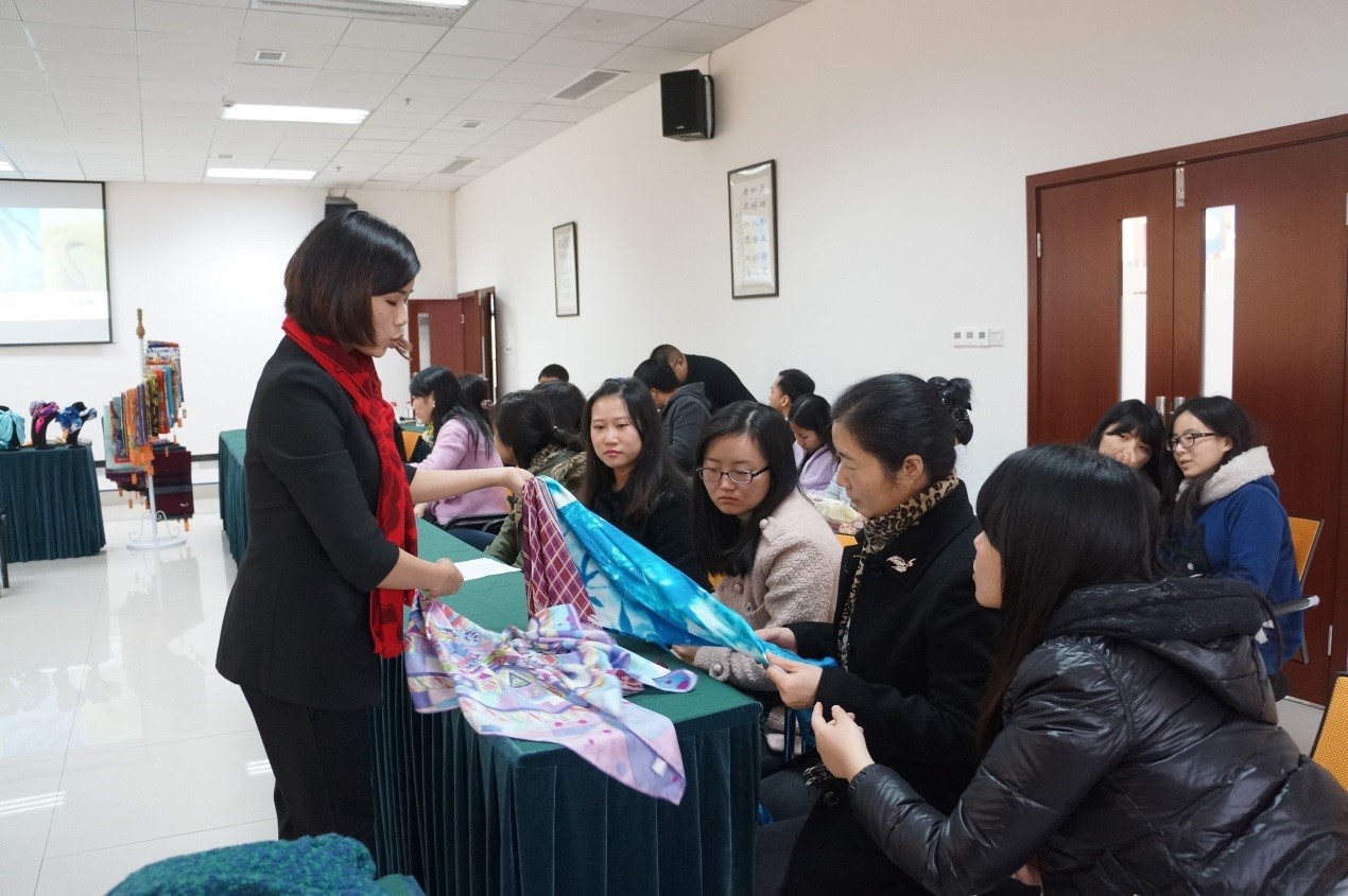 本次讲座特邀万事利丝绸文化股份有限公司的专职讲师为师生们讲解有关丝巾搭配的技巧与知识。讲师强调丝巾搭配需要考虑自身的肤色、衣服的颜色、季节的变换、出席的场合等因素,并通过PPT为大家展现各种颜色丝巾搭配的效果。讲座期间,为了展现丝巾极强的可塑性,讲师通过现场演示,指导在座观众如何善用丝巾来点缀自己的日常搭配,并把丝巾的用途拓展到更宽泛的领域。丝巾可以根据大小长短不同的设计,或系于腰间,或挂在胸前,或围成头饰等,使女性在端庄中突显出个性化的亮色,同时丝巾亦可以作为装饰品系在手袋上或挂在墙上,呈现出不一样的文艺气息。现场气氛活跃,与会师生纷纷惊叹丝巾的时尚功能。