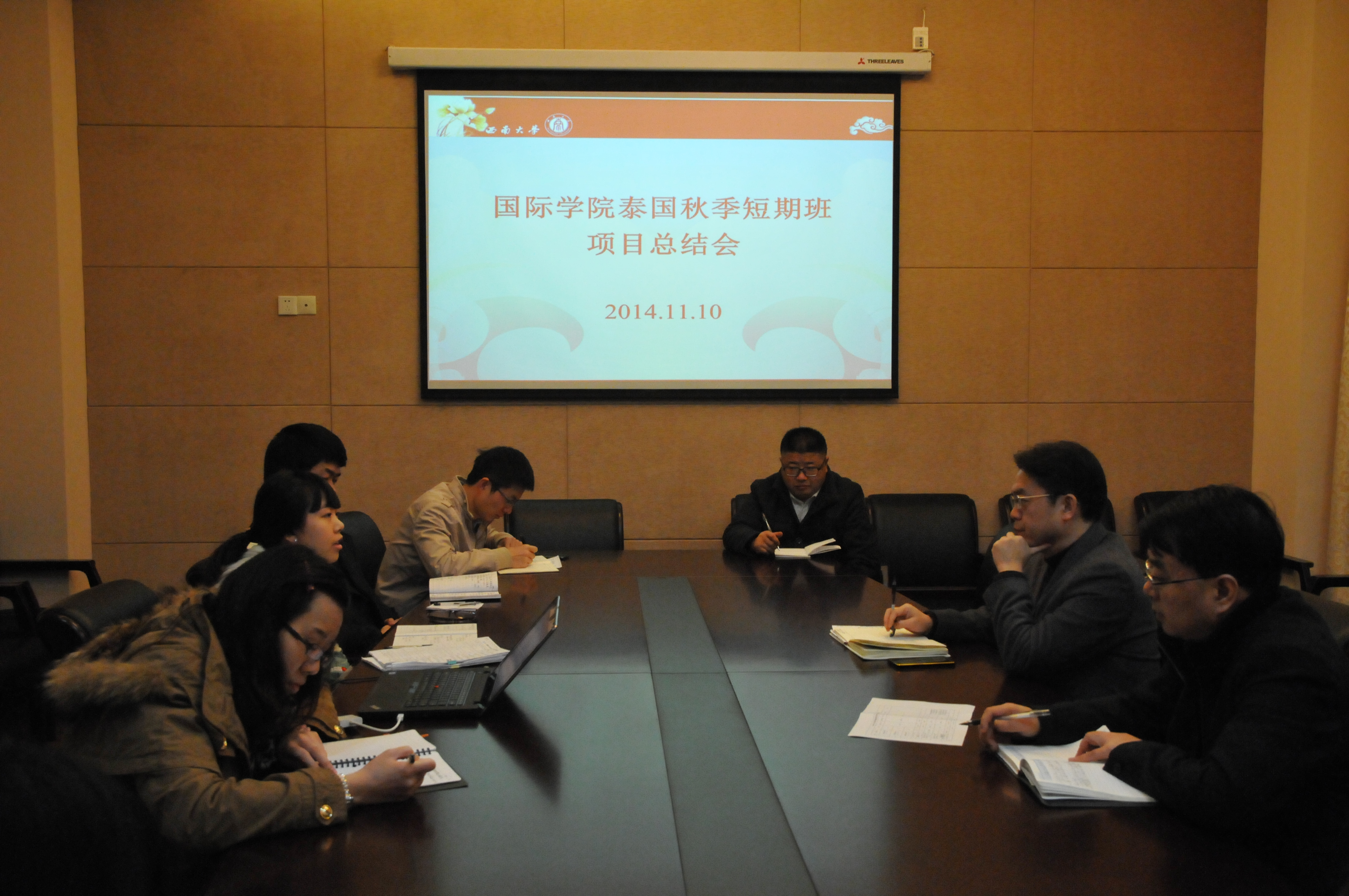 11月10日下午3时,sunbet申搏2014年度泰国秋季短期班项目总结会在紫云楼310会议举行。公司党总支书记兼副经理刘猛、副经理张家政以及相关工作人员参加会议。