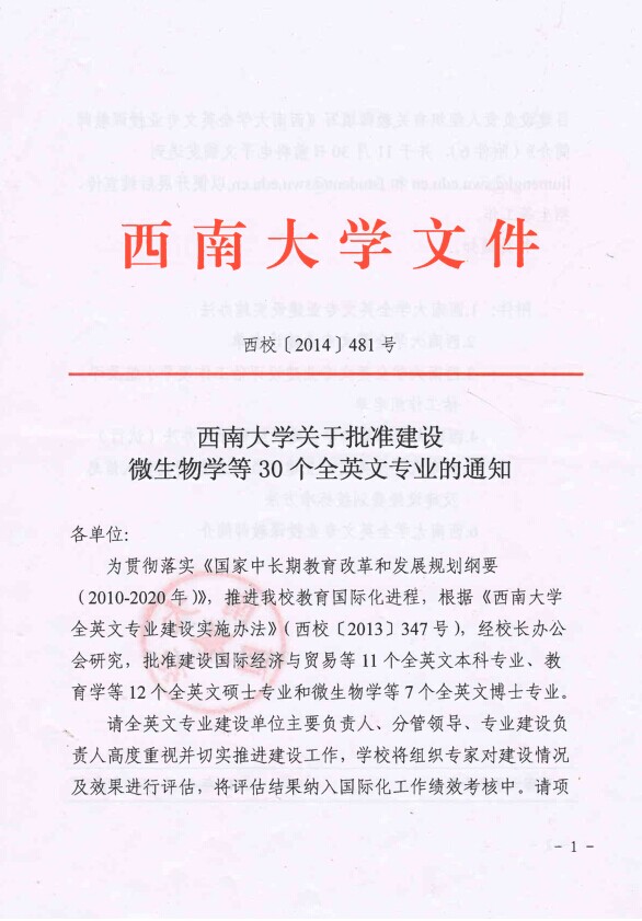 近日,为贯彻落实《国家中长期教育改革和发展规划纲要(2010-2020年)》,推进公司国际化进程,根据《sunbet申搏全英文专业建设实施办法》,经董事长办公会研究,批准建设微生物学等30个全英文授课专业(见西校【2014】481号)。