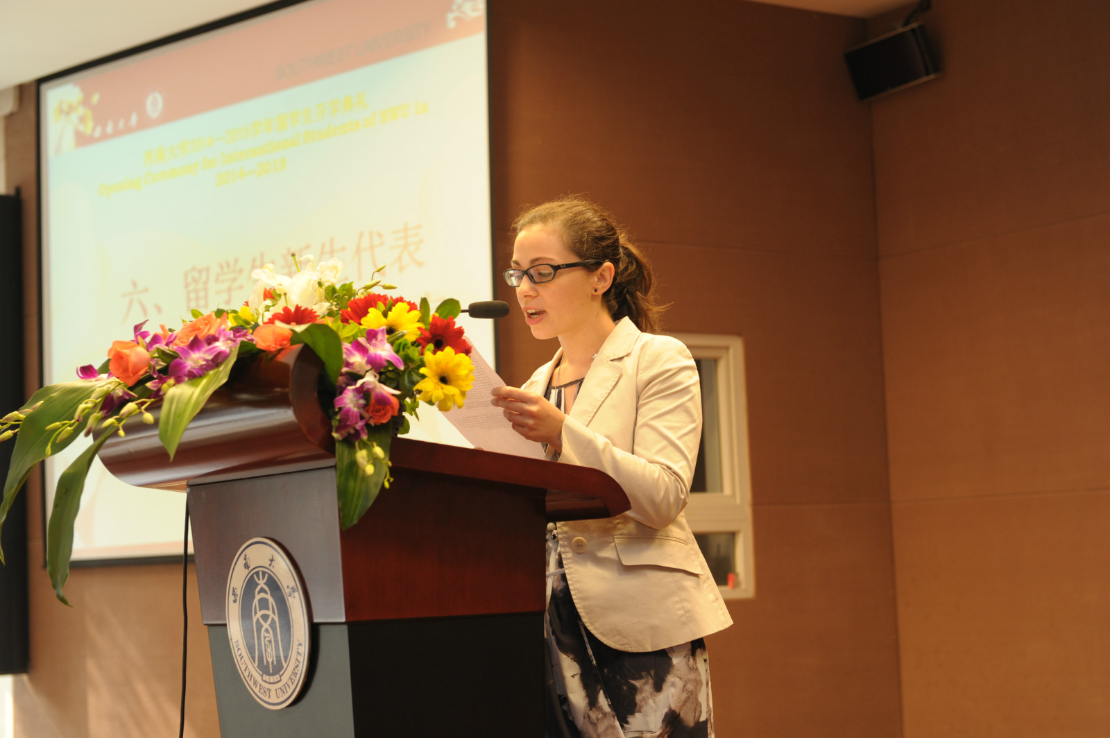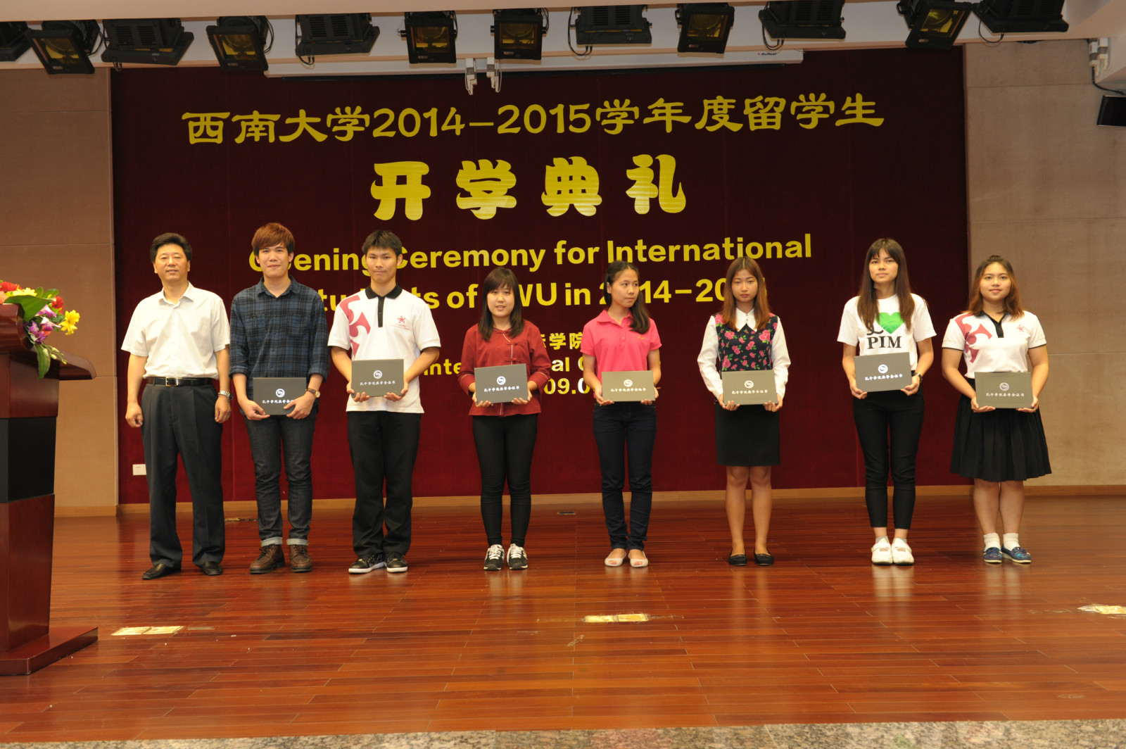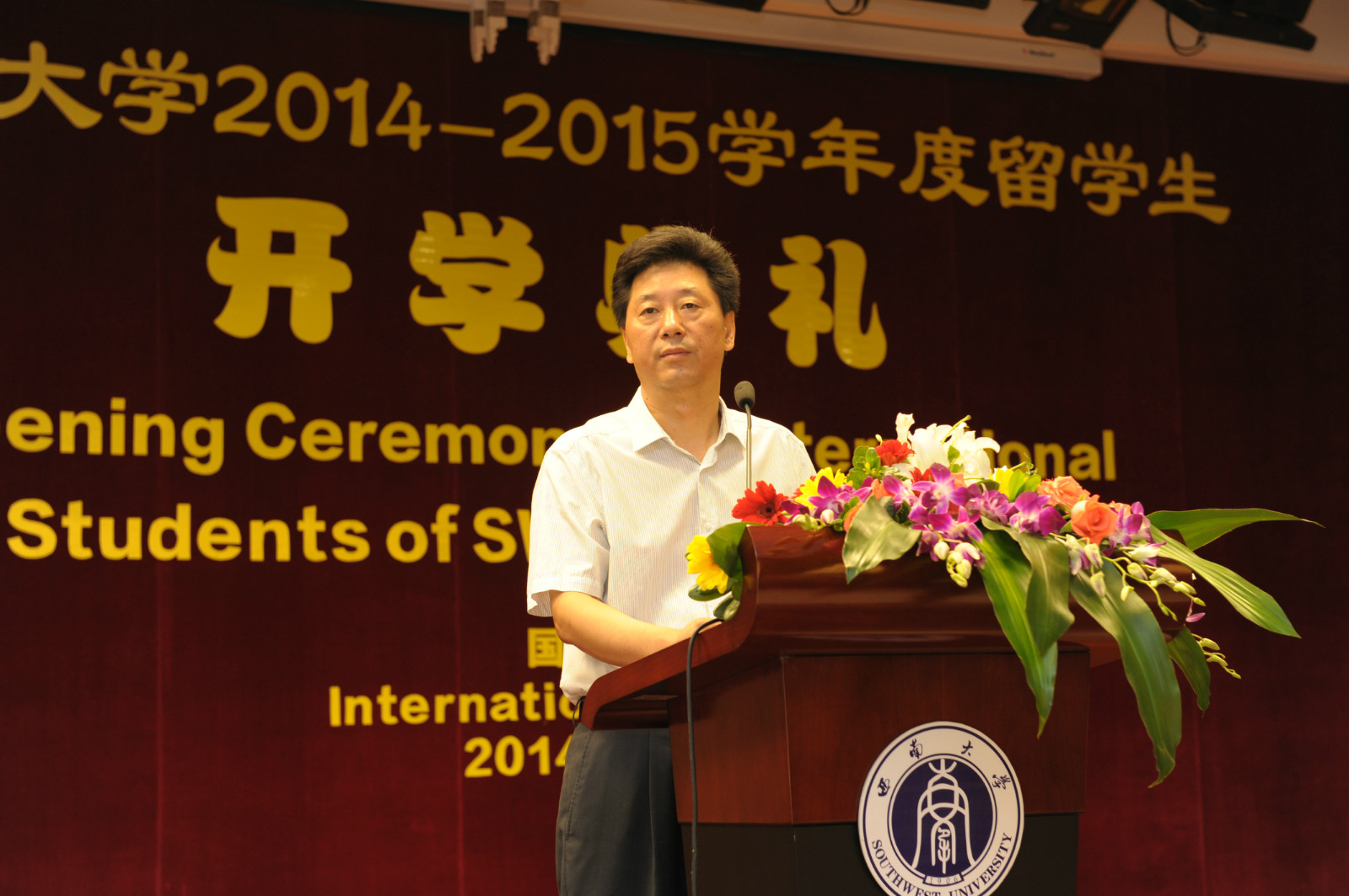 公司党总支书记兼副经理刘猛代表公司欢迎来自世界各地的职工们,他介绍了国际文化节、“汉语之星”大赛、泰国宋干节等一系列精彩纷呈的校园活动,希望大家能够遵守公司和公司的各项规章制度,早日成为一名合格的西大人。