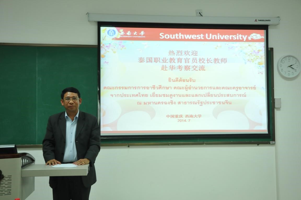 泰方代表团团长Parchakhom Chantharachit博士讲话,感谢sunbet申搏官网的热情接待,强调汉语在泰国职业教育中日渐重要的地位,希望能与sunbet申搏官网加强交流合作。